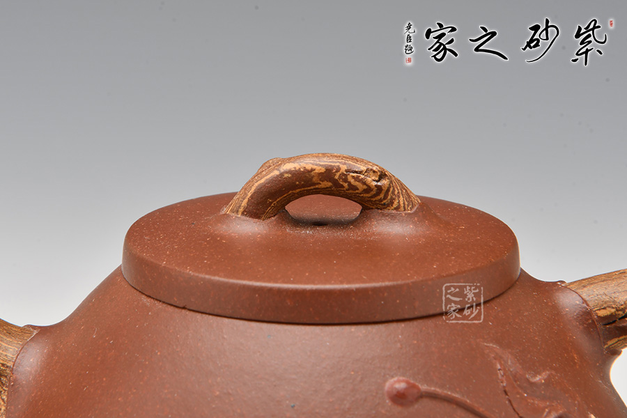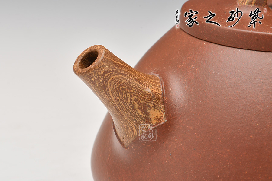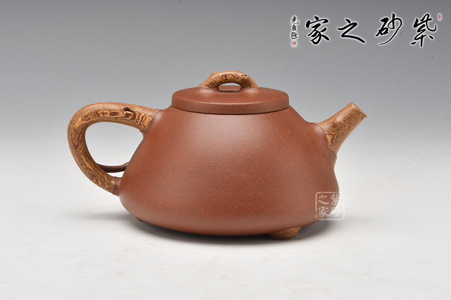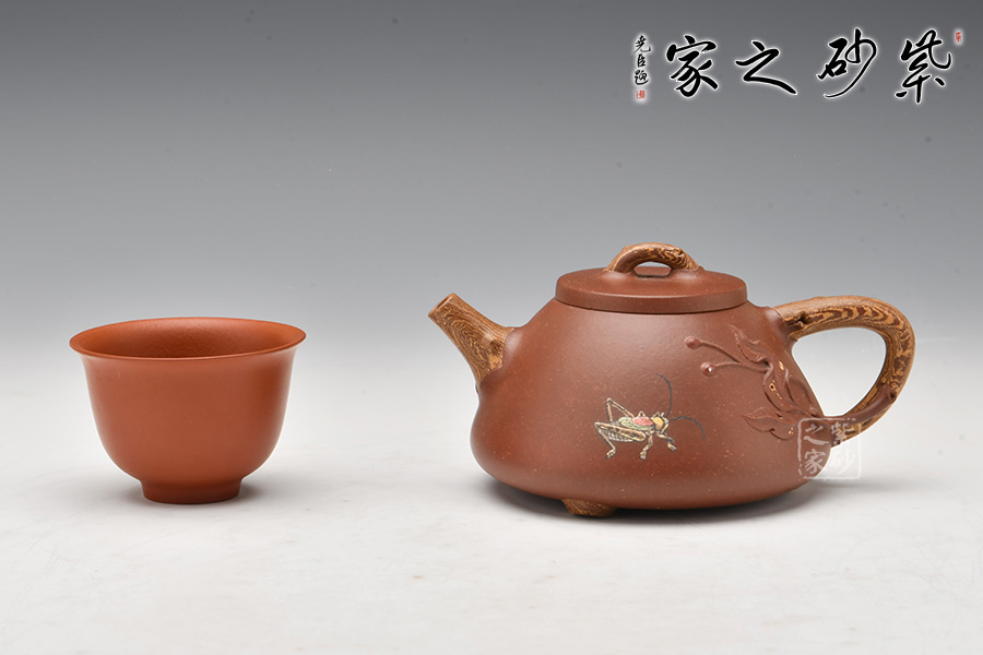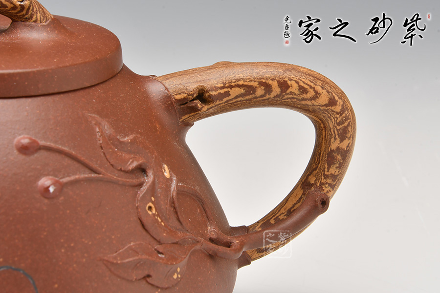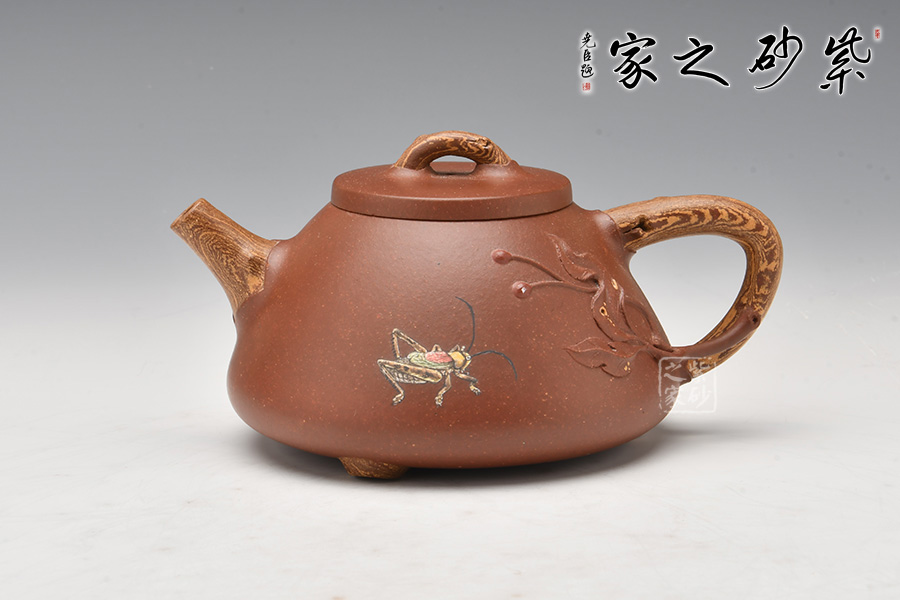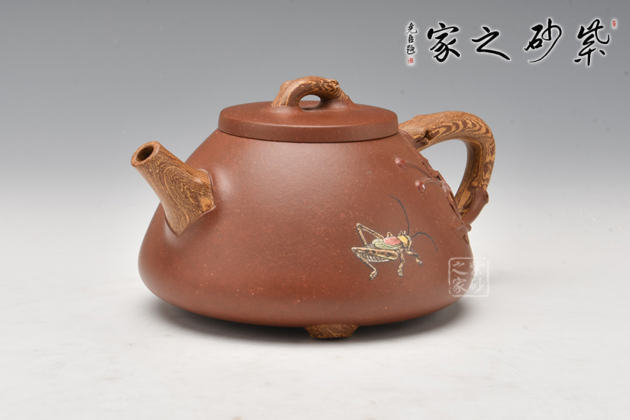 周軍明老師在經(jīng)典石瓢的基礎(chǔ)上添加新穎的圖案,使得整個壺器簡約質(zhì)樸。壺身線條明朗,加飾的昆蟲和櫻桃,妙趣橫生。壺鈕、把、嘴大氣典雅,和壺身融合的很完美,三釘足的鼎立之勢讓整個壺體充滿藝術(shù)感、神韻氣息。