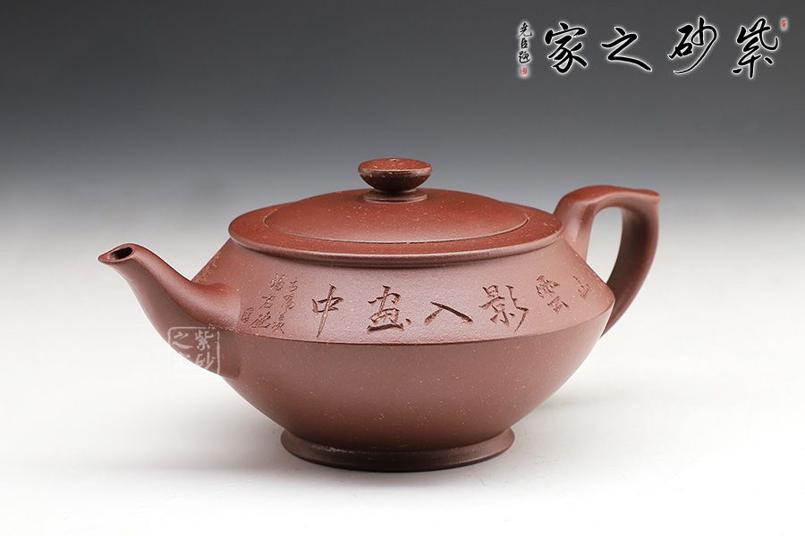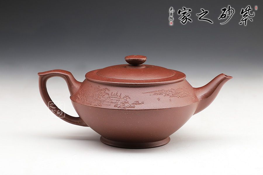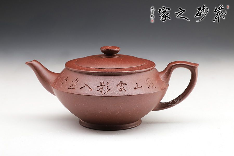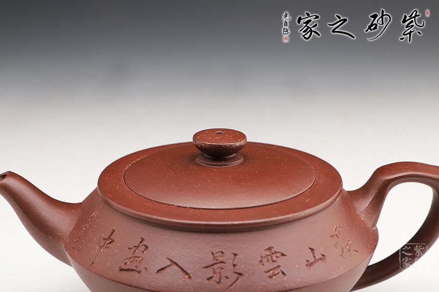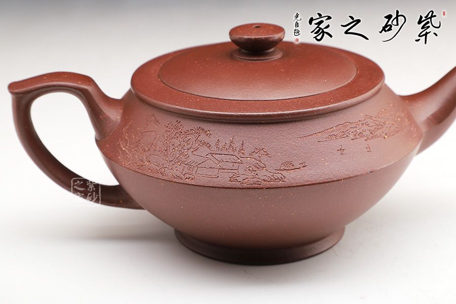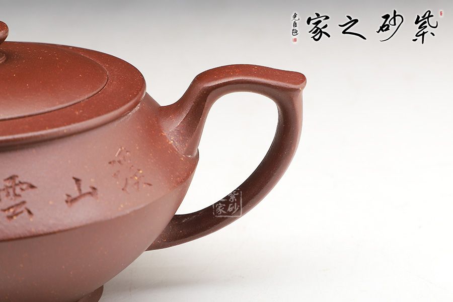 此壺是馬吉和其師傅泥料大師王福君合制之作,壺型似笑櫻,器型靈動飄逸,秀美非凡,壺把鈕搭配壺身韻味十足,江蘇省陶瓷藝術(shù)名人王福君刻繪,“溪山云影入畫中”與山水畫面相得益彰,頗為難得