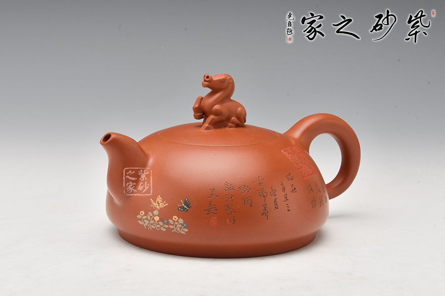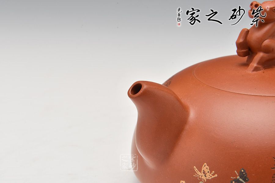 作品壺身扁圓,穩(wěn)妥飽滿,身、流、把光滑紅潤(rùn),壺身彩繪蝴蝶在花叢中飛舞,寓意生命的活力和堅(jiān)強(qiáng)。
