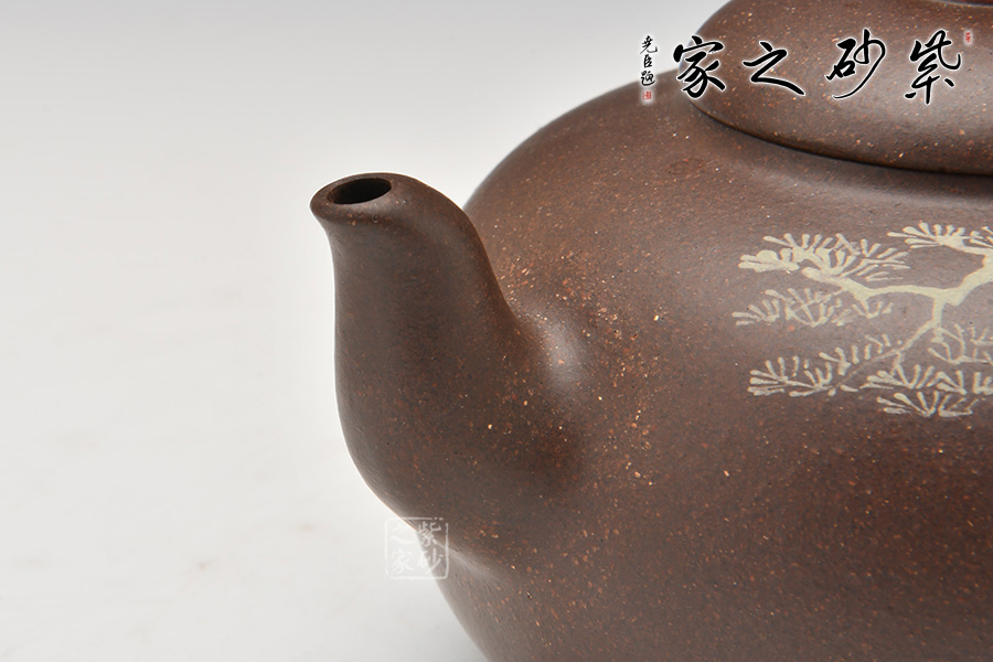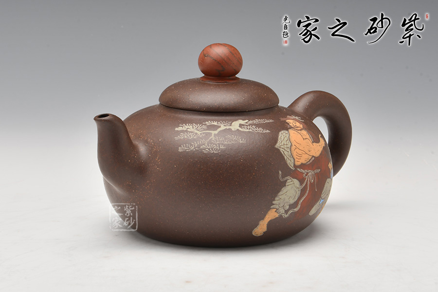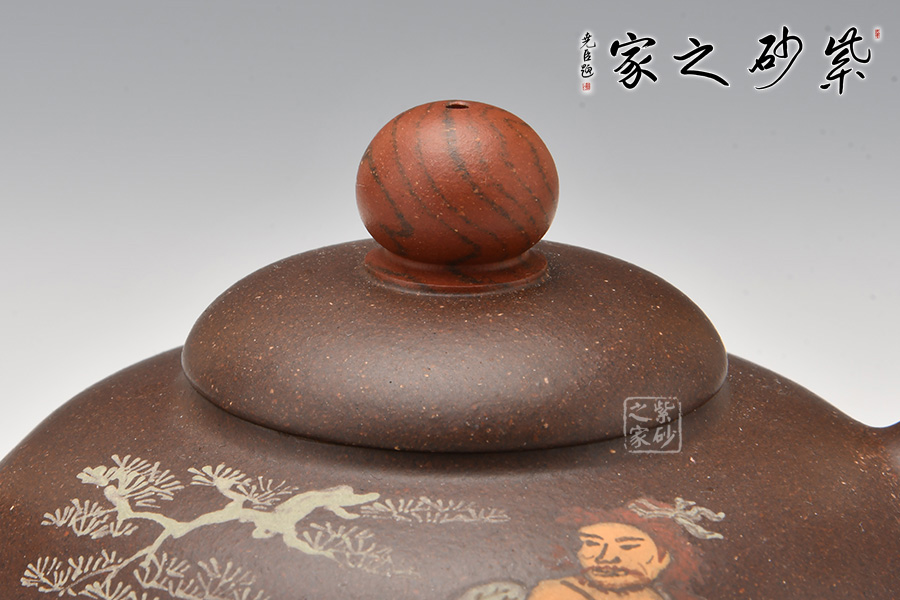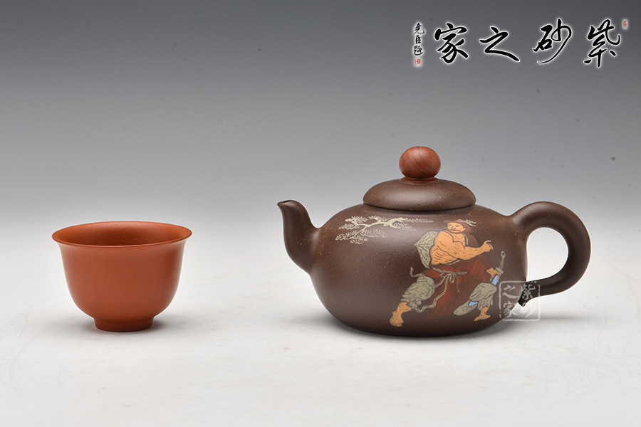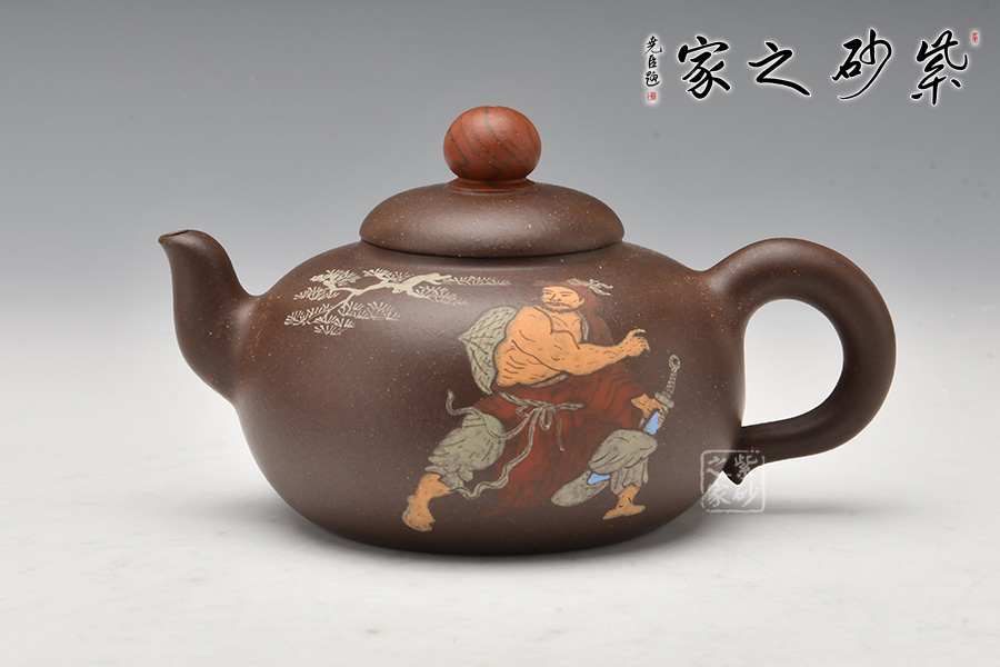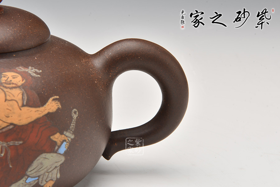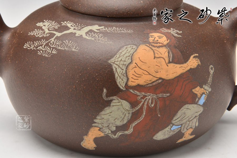 此壺以水滸傳為主題,在經(jīng)典壺型的基礎(chǔ)上,融合人文氣息。壺身通過彩繪描述了水滸傳中的英雄劉唐,壺腹圓潤飽滿,圓形鈕壺鈕和平蓋的壺蓋更加突顯了氣勢磅礴,歷史悠久的傳統(tǒng)文化。