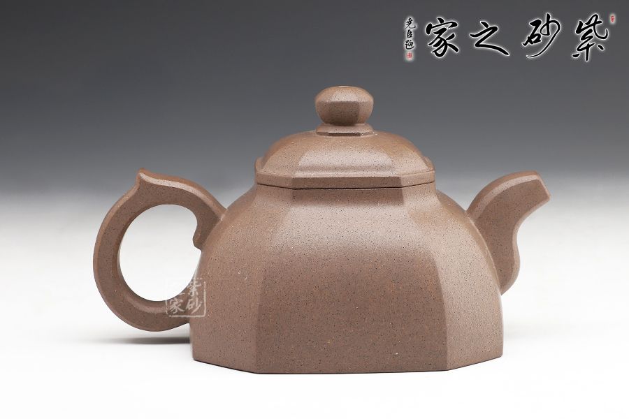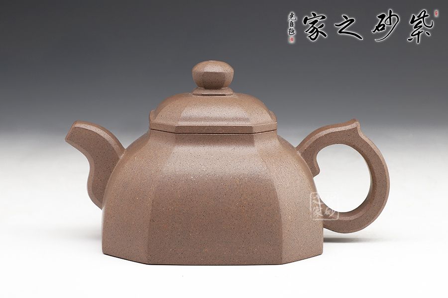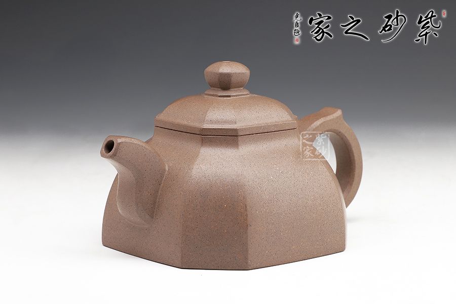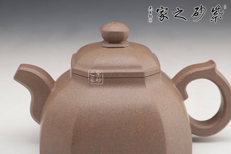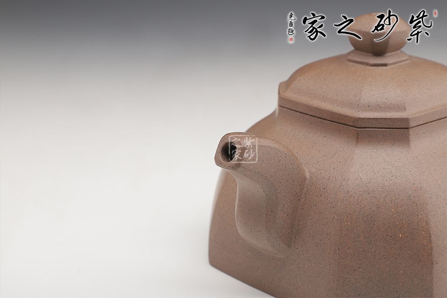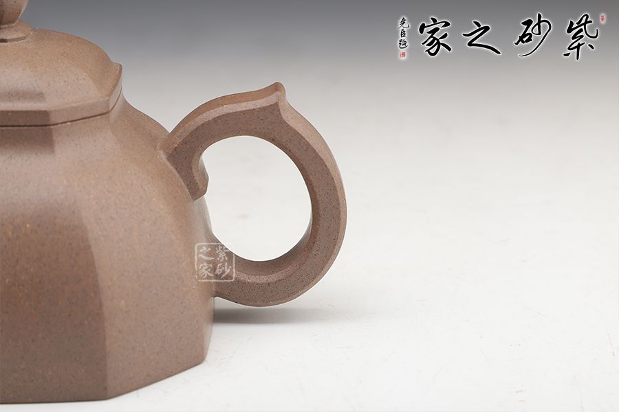 此壺方正圓潤(rùn),美觀動(dòng)人。壺身的四方形中融入圓形,四角被切去,圓滑里有工整自然。子母線的圓潤(rùn)非常動(dòng)人,平整細(xì)膩,足見工藝高超。蓋上鼓起,八方珠鈕小巧精致。彎流嘴上下粗細(xì)變化獨(dú)特,弧線的美感十分突出。壺把粗細(xì)一致,端握趁手。