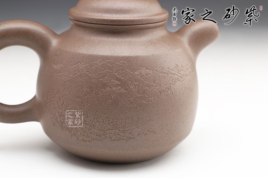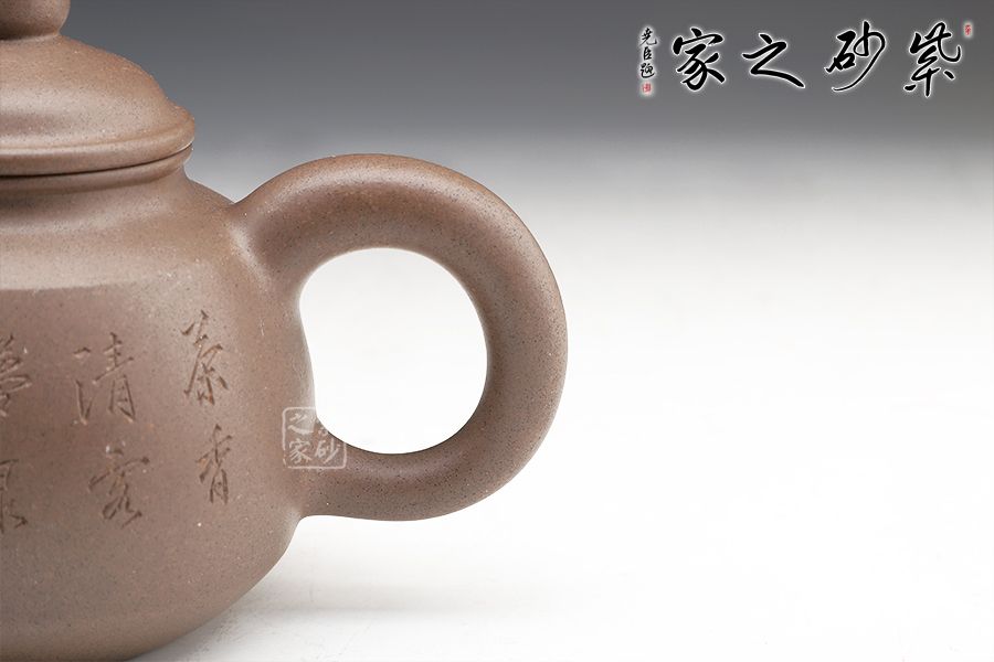 此壺高雅大方,頸部和底足相互對應(yīng),更顯氣質(zhì)優(yōu)雅。子母線壓蓋設(shè)計(jì),對接工整。鼓蓋簡潔流暢,珠型鈕精致圓潤。壺把和壺嘴的造型都很傳統(tǒng),壺把環(huán)形,渾圓厚重,壺嘴彎流,線條簡單。整個壺型厚重而不苦悶,優(yōu)雅又不輕佻。