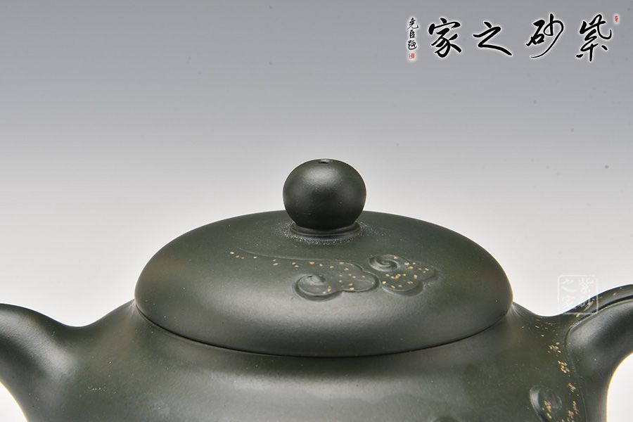壺肩、壺腹、壺底線條流暢,圈足;肩部以上作頸,線條承接順滑流暢。一彎嘴,出水有力;壺身壺蓋均有祥云紋樣,鋪砂在祥云上做裝飾,延申至圓形耳把帶飛,靈動(dòng)十足,值得賞用。