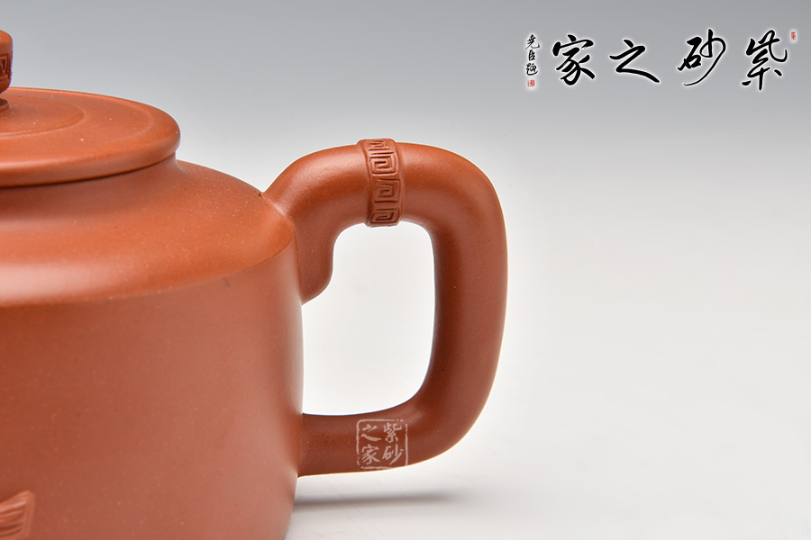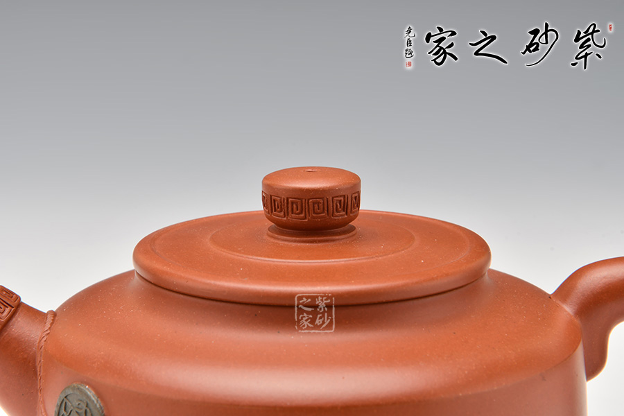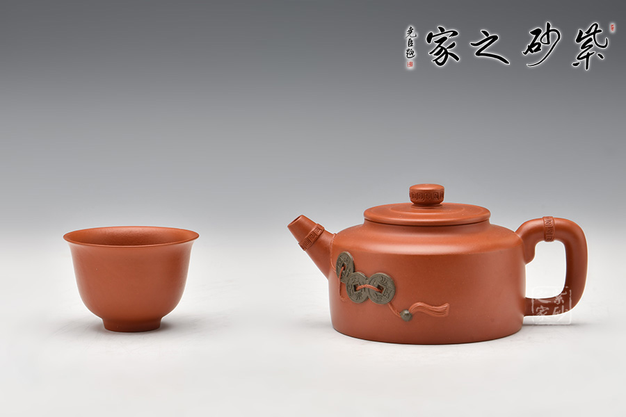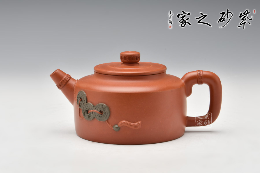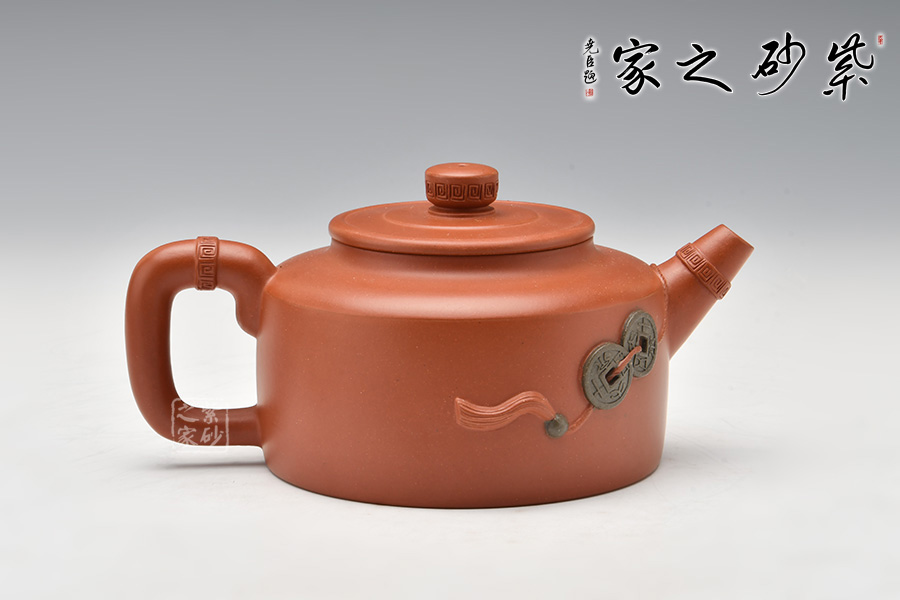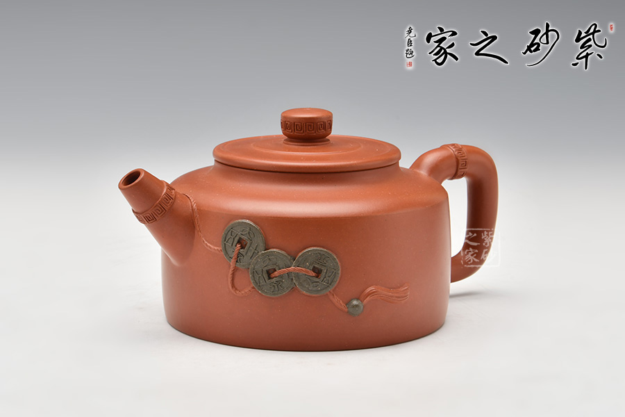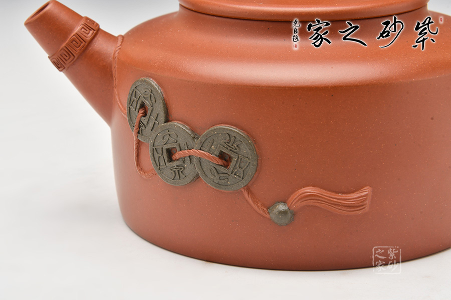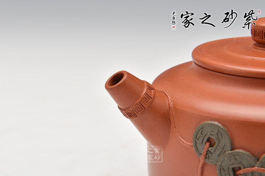 此壺采用朱紅泥料,質(zhì)樸拙雅,美冠群倫,壺體挺秀穩(wěn)重,端凝大方,比例恰當(dāng),線條明朗,壺身貼塑銅錢,和壺腹搭配的恰到好處,壺鈕為點睛之處,象征著前途如錦繡一樣十分美好!