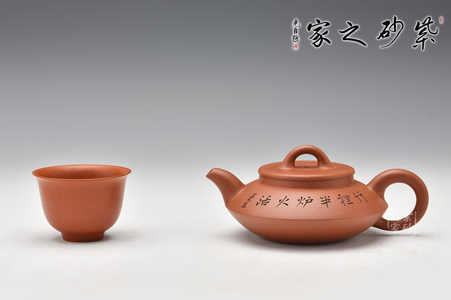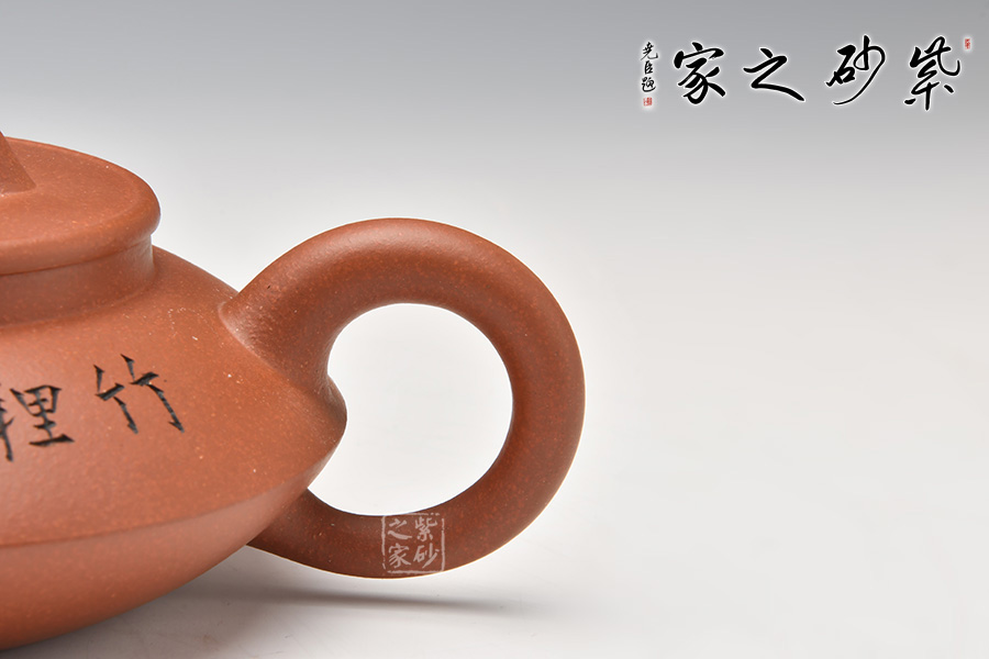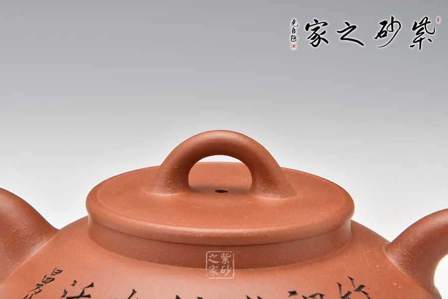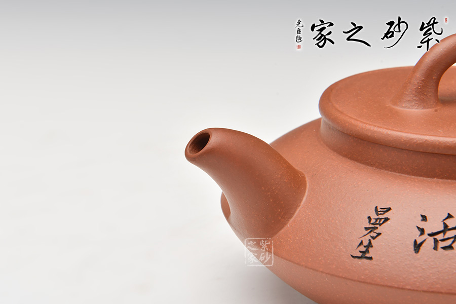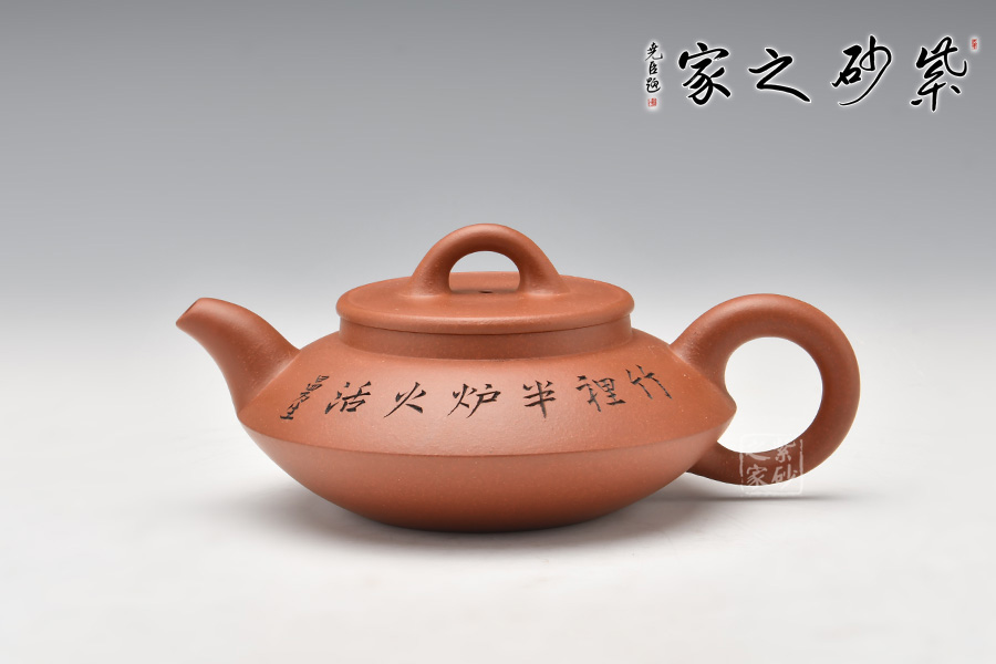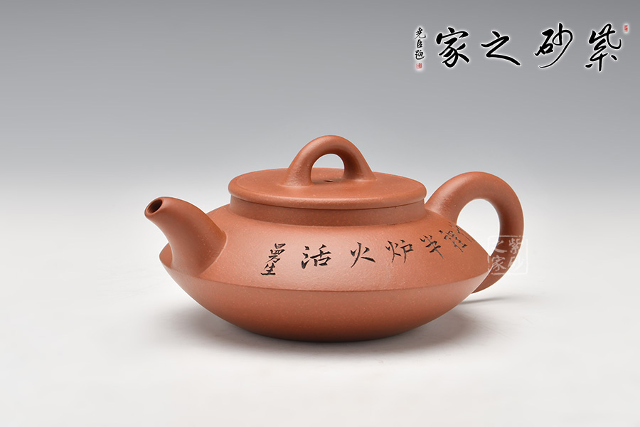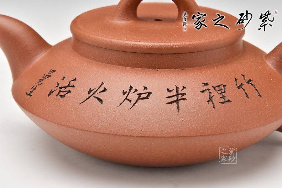 這是一個(gè)經(jīng)典的合盤壺,由底槽青泥制成,色澤細(xì)而純正,精致典雅。壺身由上、下盤兩部分組成,上盤像個(gè)反扣著的碗,下盤像個(gè)小碟子。壺腰線鼓出,向上、下呈 反弧收斂。壺腹上部刻繪的文字,使得此壺古樸端莊,值得擁有!