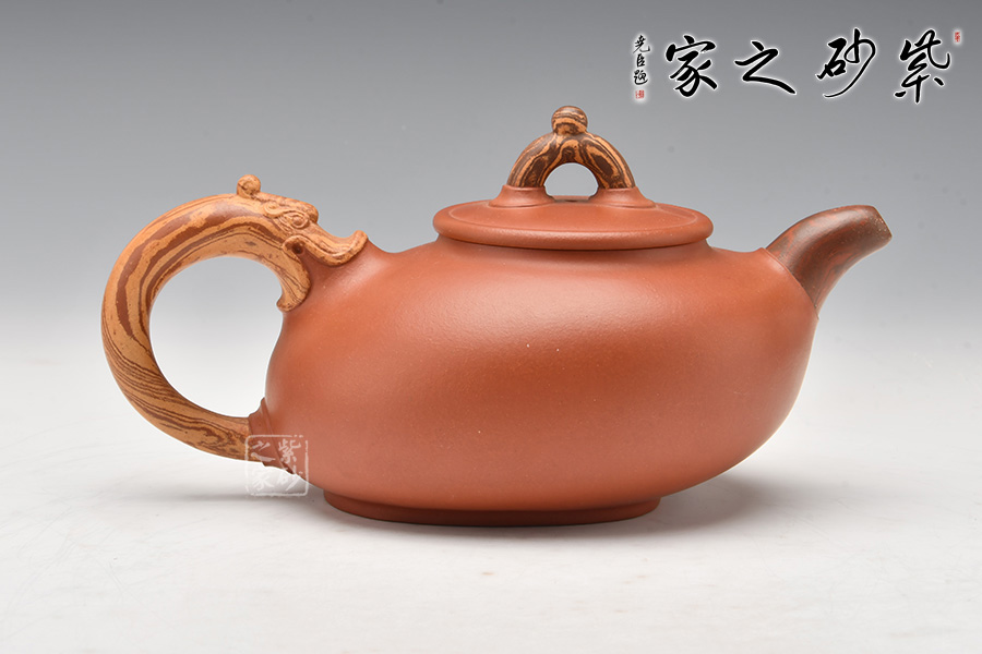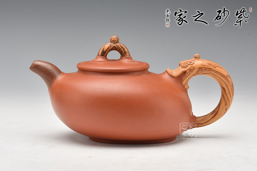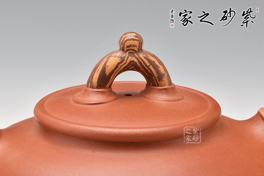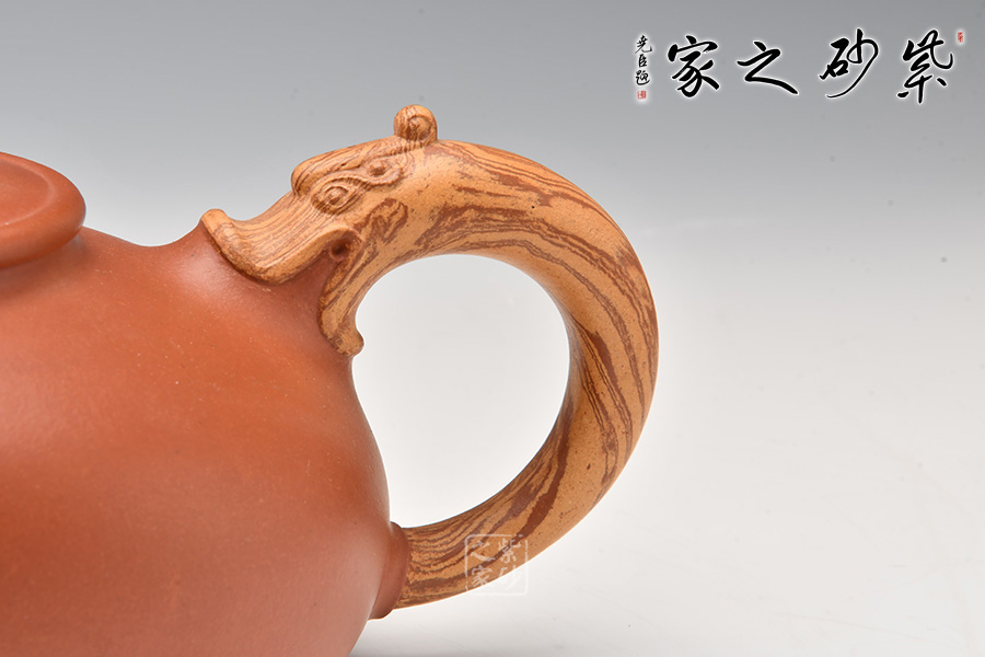 此壺是老師在傳統(tǒng)壺型上改動而來,壺型由原礦清水泥制成,色澤紅潤。壺身呈橢圓形,壺蓋為平蓋,壺鈕和壺把的創(chuàng)新襯托了整體的新穎。壺體簡潔,充滿濃厚的醇和爾雅文人氣息。