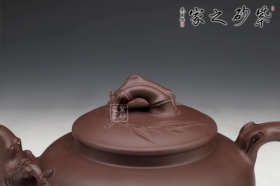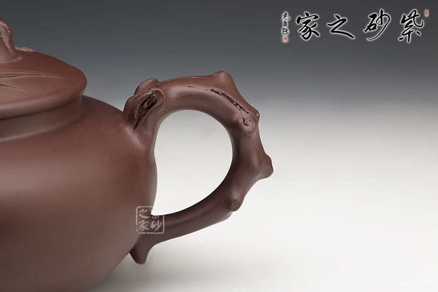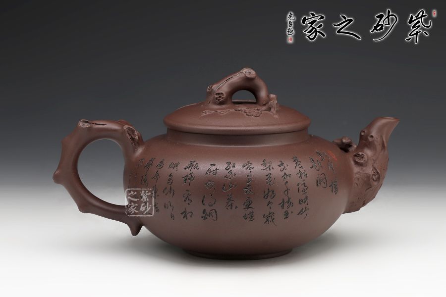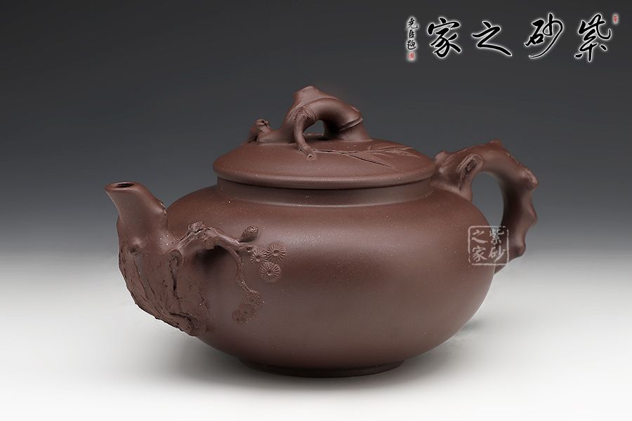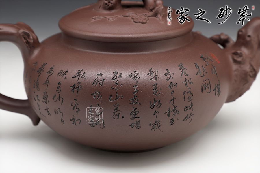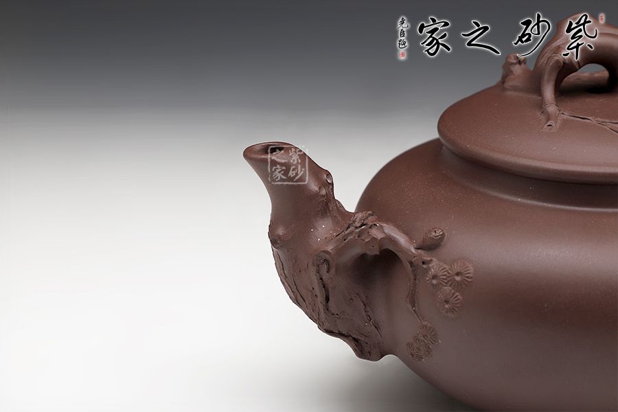 以梅枝為壺把、壺嘴、壺扭。而三處梅枝各具形態(tài),每處梅都是旁逸斜出而又神態(tài)各一,把玩此壺就有一種守著一片梅園,有暗香浮動(dòng),處處生花。真切體會(huì)到陸游賞梅的感覺:何方化作身千億,一樹梅花一放翁。