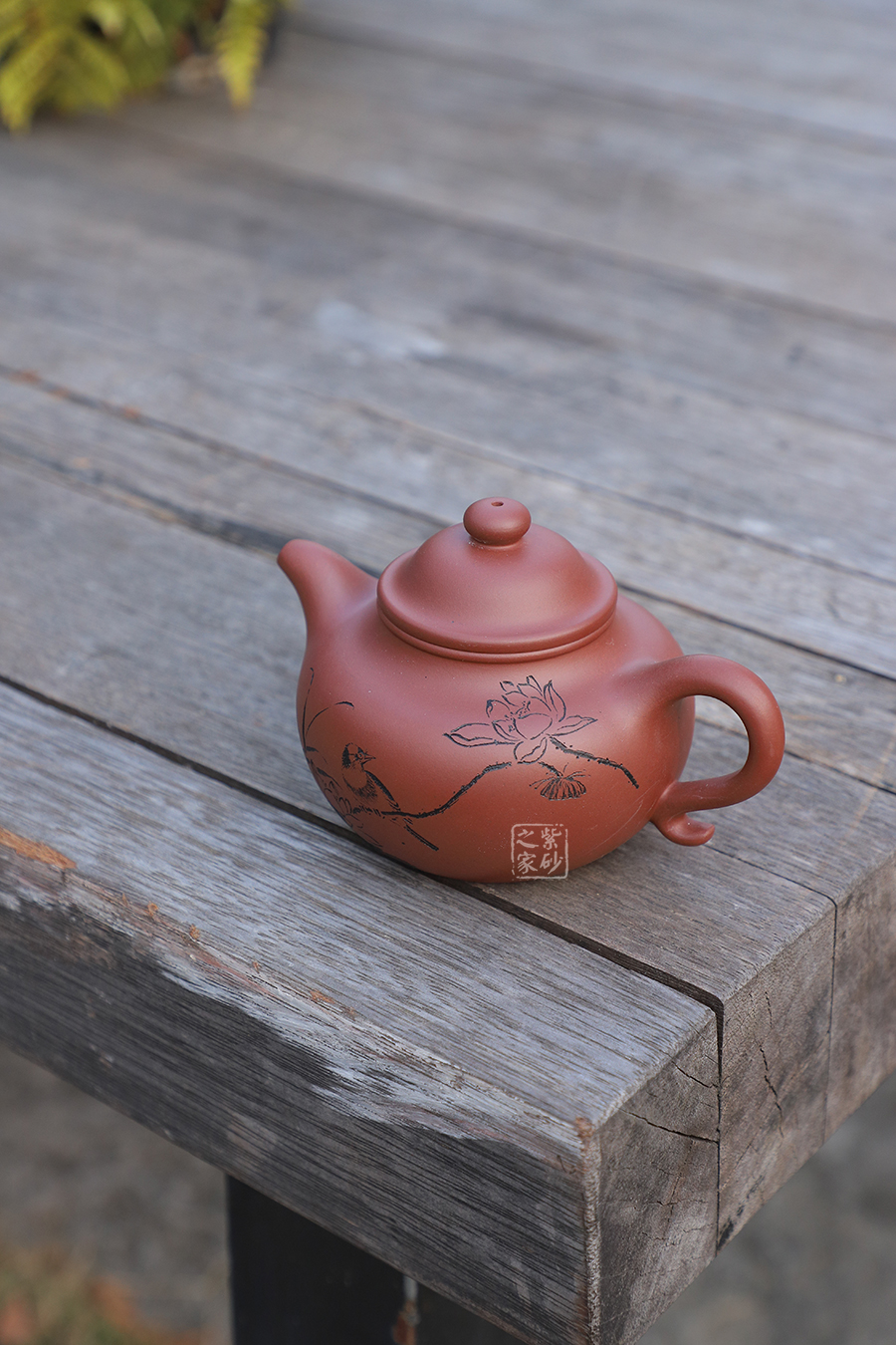 蓮子壺是傳統(tǒng)的壺式之一,這款蓮子精選原礦段泥制成,質(zhì)感柔而潤(rùn),細(xì)而不膩,淡泊寧?kù)o;此壺如傳統(tǒng)形制一般,造型古樸,腹圓而鼓,壓蓋蓋面蓬勃飽滿,氣密性良好;暗接耳形把彎曲有致,弧度大小合適;一彎流嘴口略微下壓,出水暢快;壺身結(jié)構(gòu)自然和諧,十分優(yōu)美,平靜中孕育著動(dòng)感,頂蓋上的寶珠鈕更具神韻。