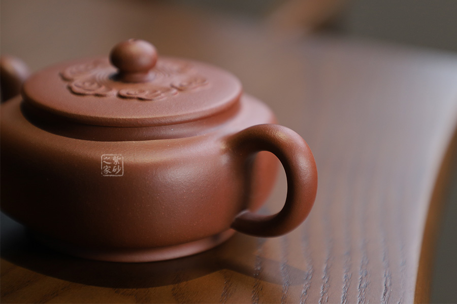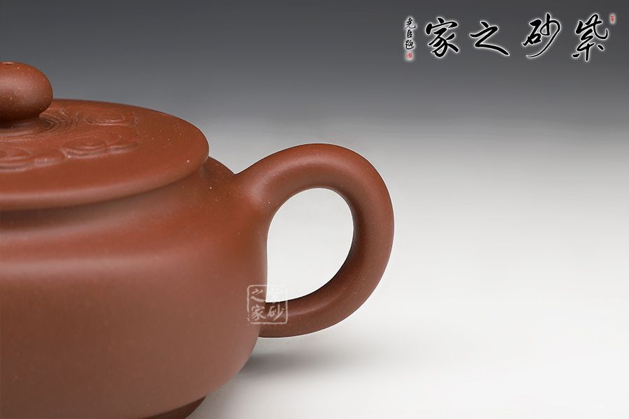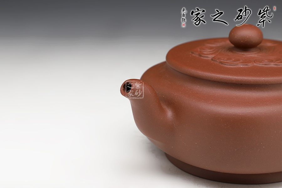 這款作品外形古樸敦厚,沉穩(wěn)周正,四方成壺身,相接處圓潤(rùn)過(guò)渡,方圓結(jié)合,剛?cè)岵?jì)。壓蓋微聳,壺鈕四方,盡顯大氣。出水爽利,圈把略見圓形,端握方便。