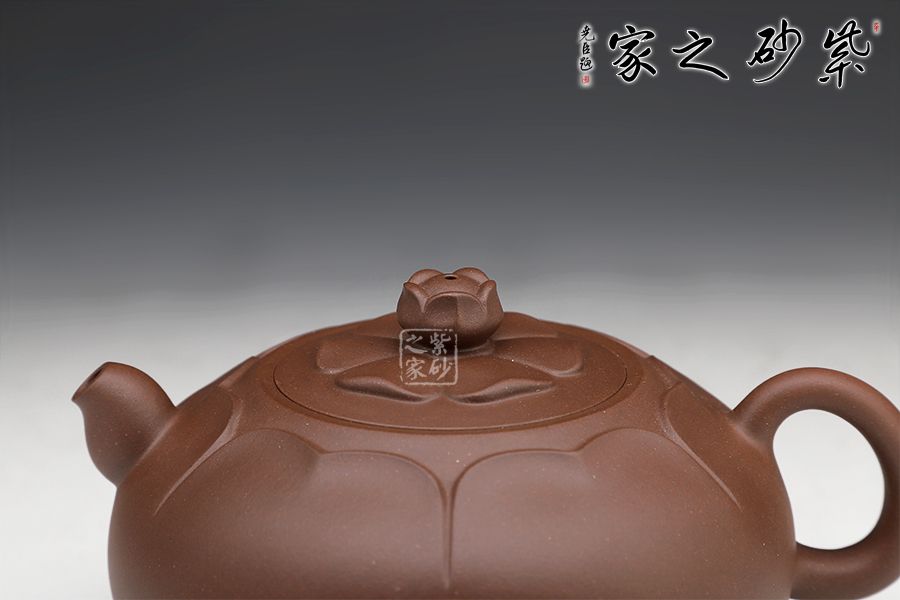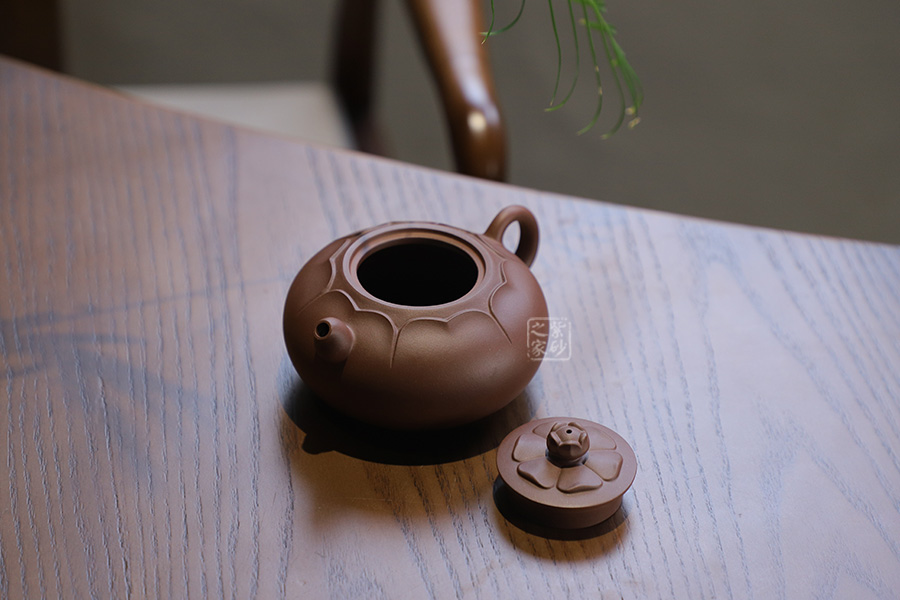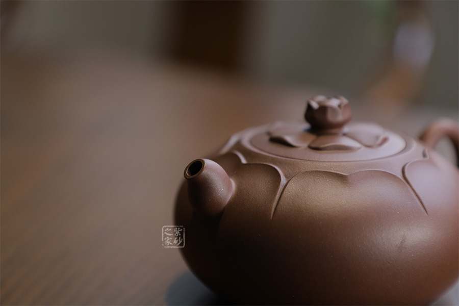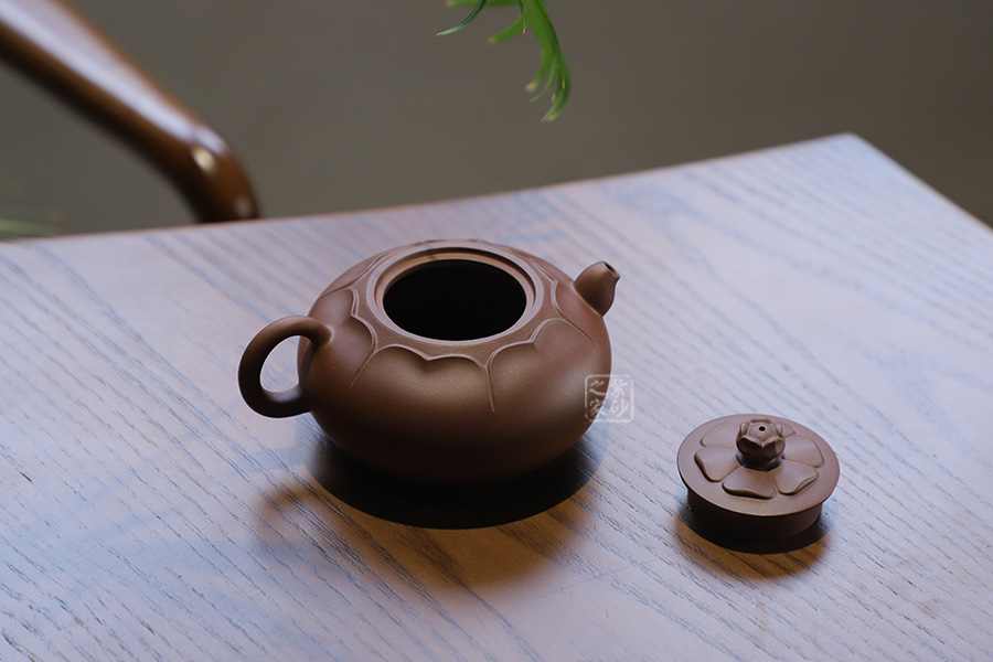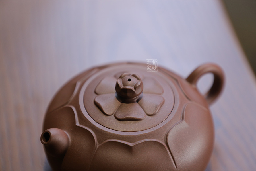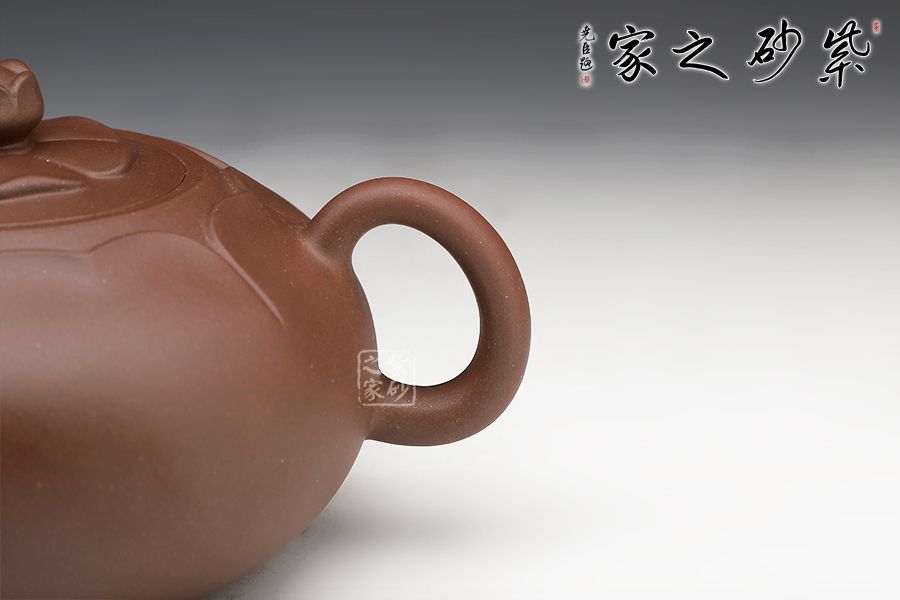 壺型制作非常用心,飽滿的輪廓配合荷花裝飾,花瓣精美,壺身圓潤,正給人以清新美妙的感受。小短嘴自成一體,獨(dú)立于壺身之外,蓮藕的造型似有若無。環(huán)形壺把圓中有方,線條爽利勁道,同樣是蓮藕外觀,更顯精致。壺蓋上的蓮蓬鈕尤其獨(dú)特,蓮子似要噴出,更加小巧可愛。