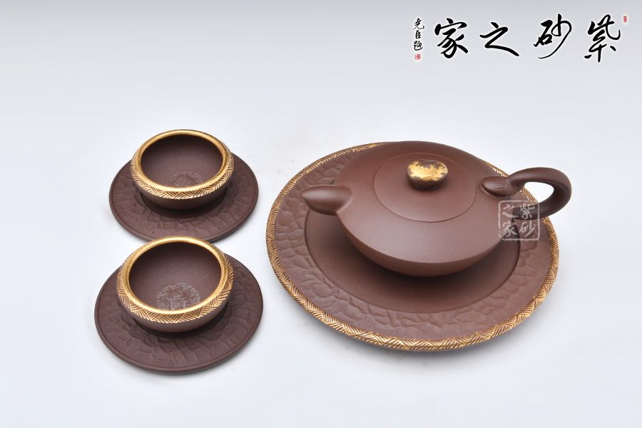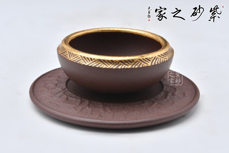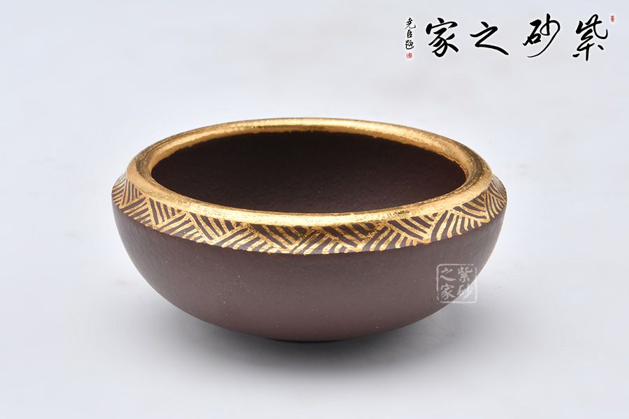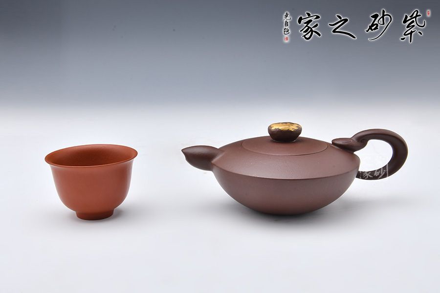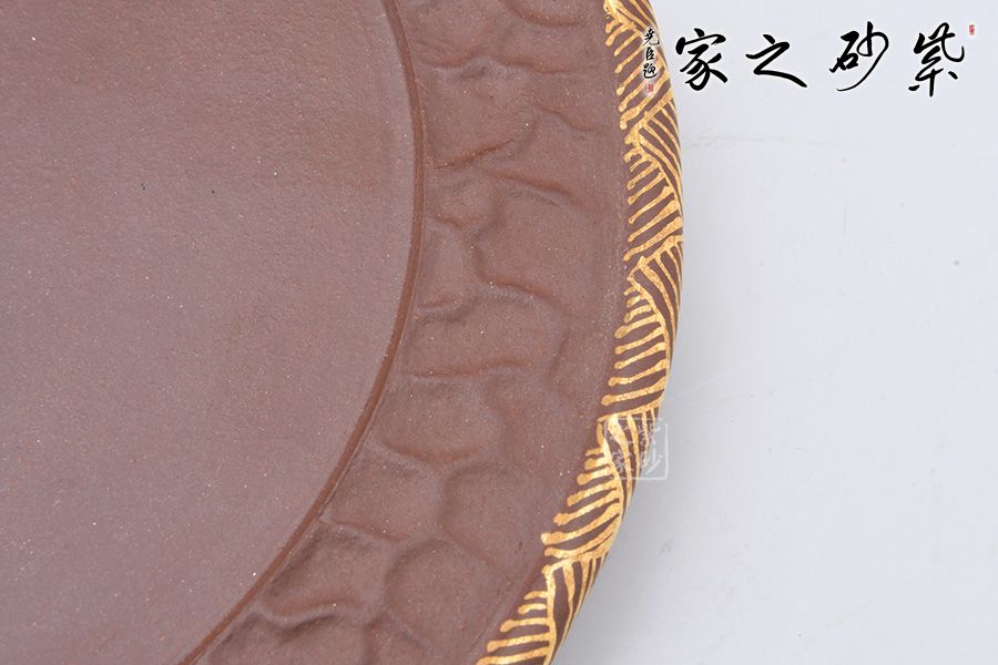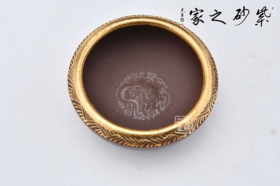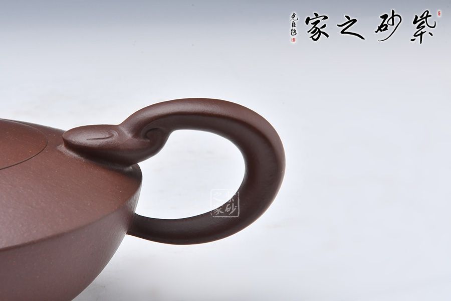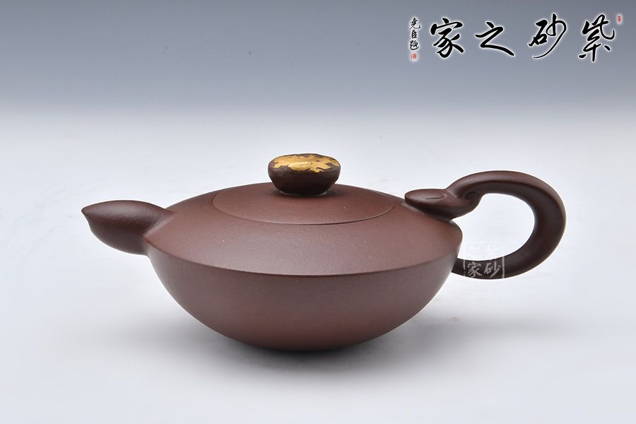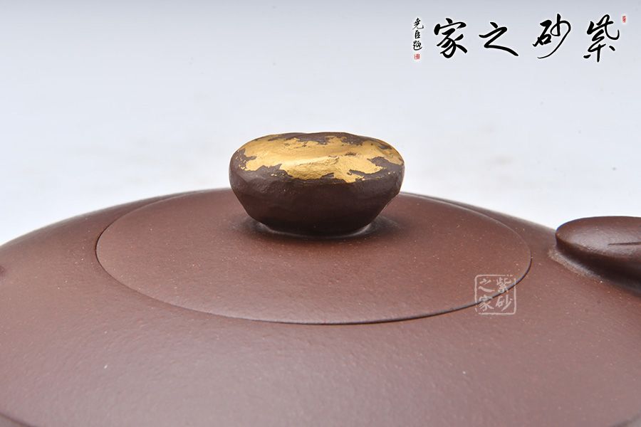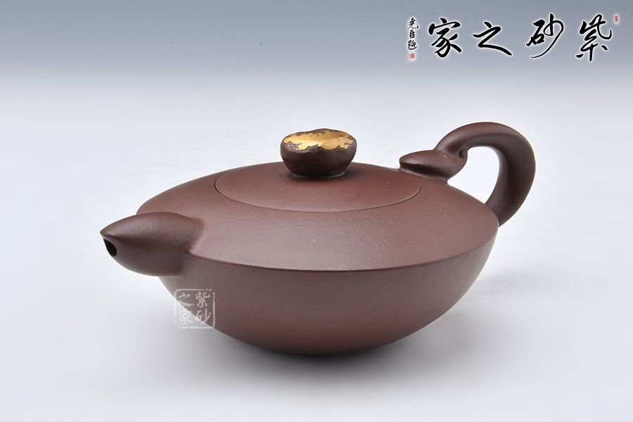 這款壺器呈半月形,上豐下斂至平底,壺腹圓潤,壺肩線條清晰明確,壺頸紋理自然流暢,壺嘴壺把與壺身協(xié)調(diào)一致,壺鈕上的鑲金和主題相應(yīng)和,整款壺器氣韻不凡,雅觀大氣,端莊儒雅。