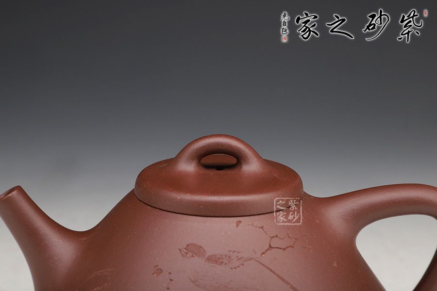 直流嘴挺峭有力,倒三角把與之應(yīng)和?!叭恕弊中蛪伢w,典型的傳統(tǒng)石瓢??谏w略大,壺身上斂下豐,壓蓋嚴(yán)謹(jǐn),實(shí)用性很好。