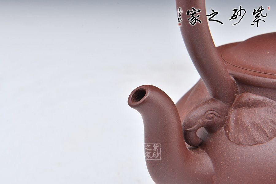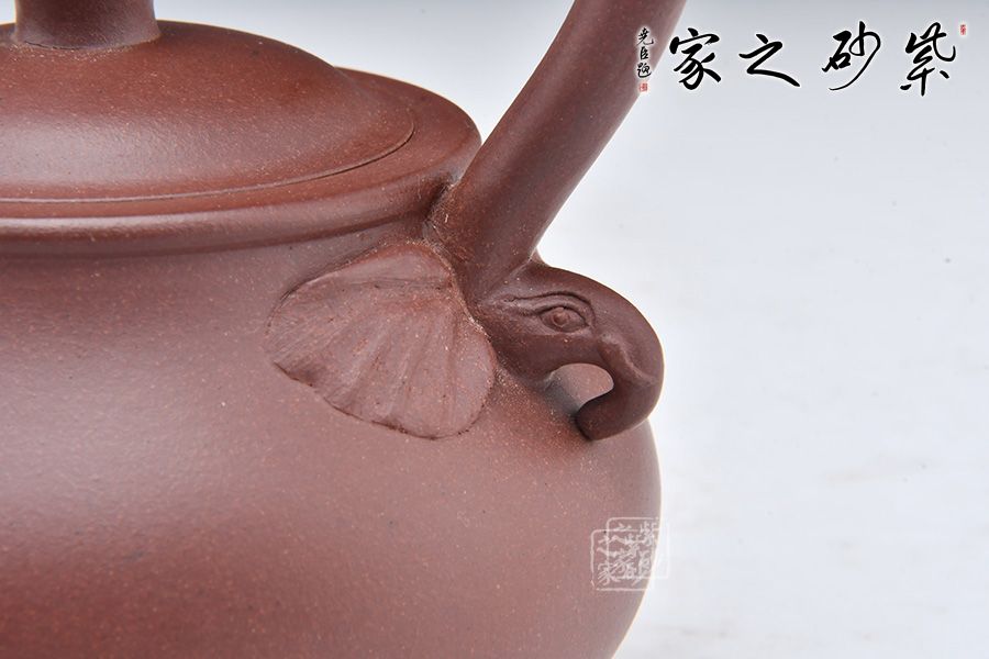 此壺壺形精致秀雅,觀之如一大象,壺腹飽滿似大象壯碩的身軀,壺嘴堅挺流順如上揚的大象鼻子,壺肩兩象鼻突出,精氣滿盈,富麗貴氣。