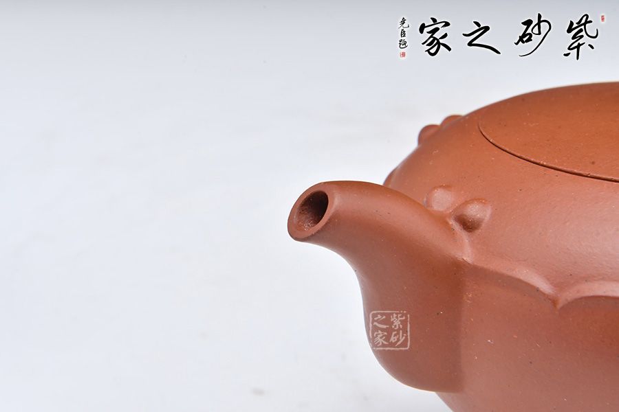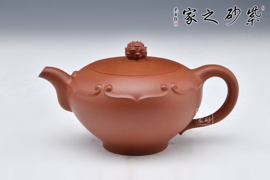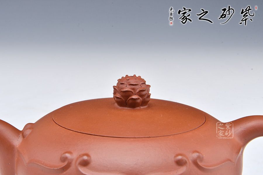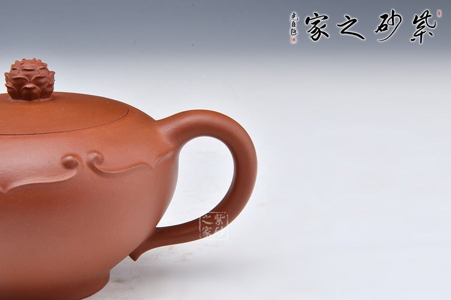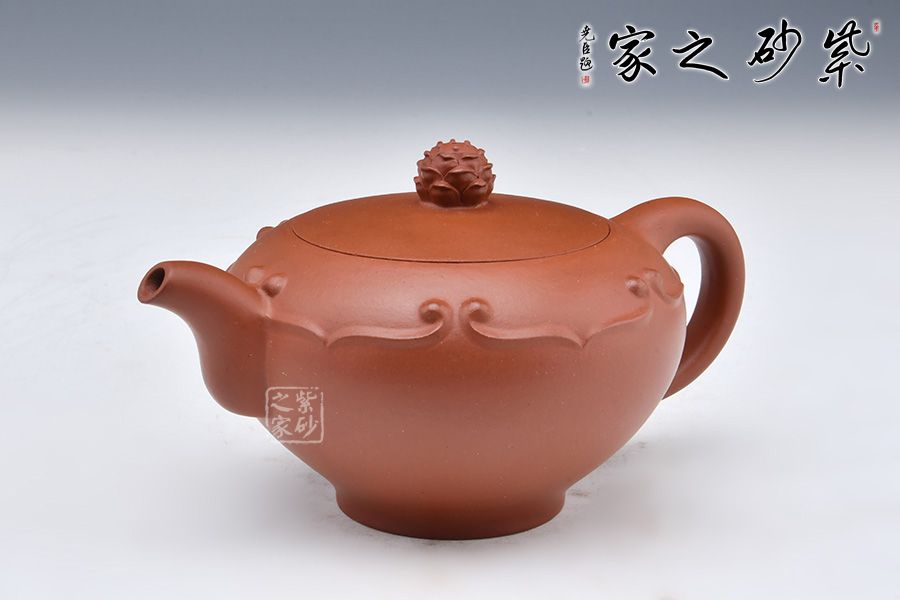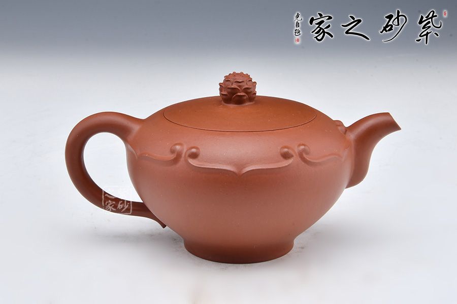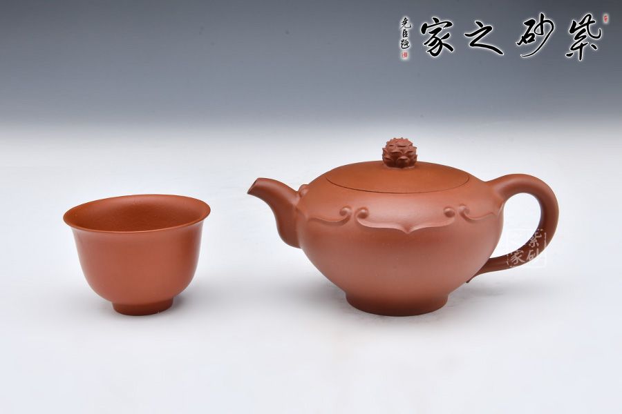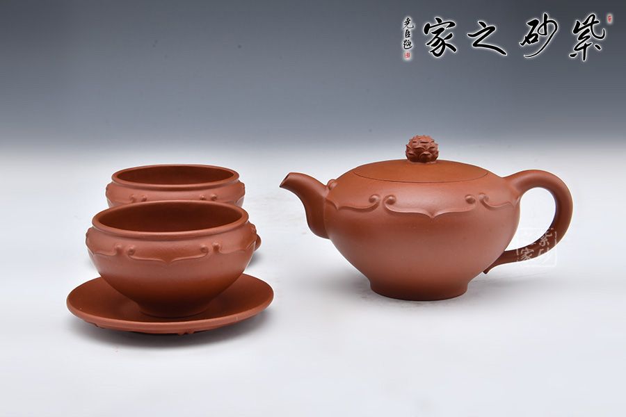 此壺器型端莊、色澤肅穆、如意紋裝飾,三者很好地結(jié)合,是難得雅致大美的好壺。壺身上豐下斂,壺蓋如包裹瓣瓣蓮花,呈盛開(kāi)狀,雕刻精細(xì),線條優(yōu)美。壺嘴憨厚,出水干凈不涎水。搭配2杯2杯墊,方便與友人共品清茶。