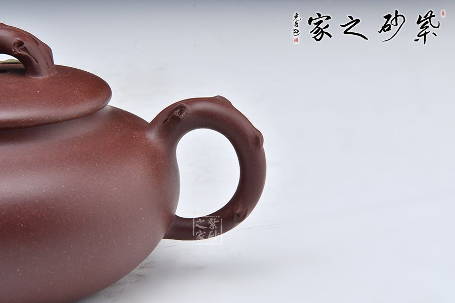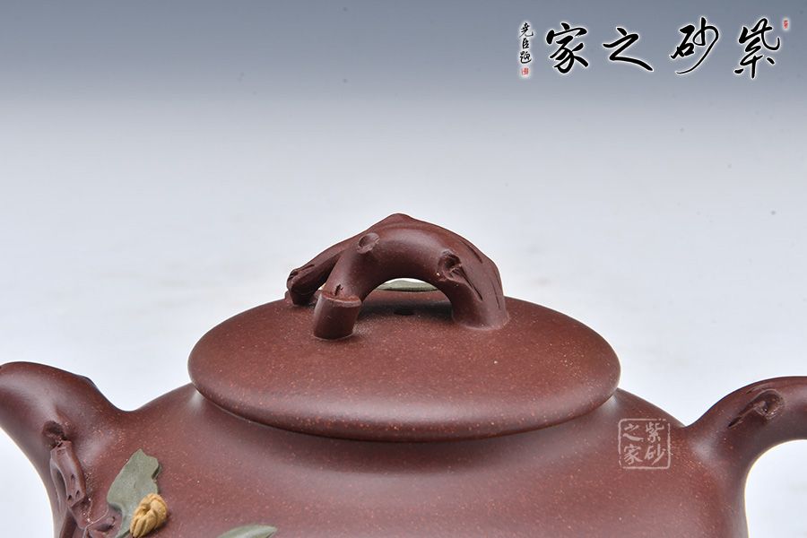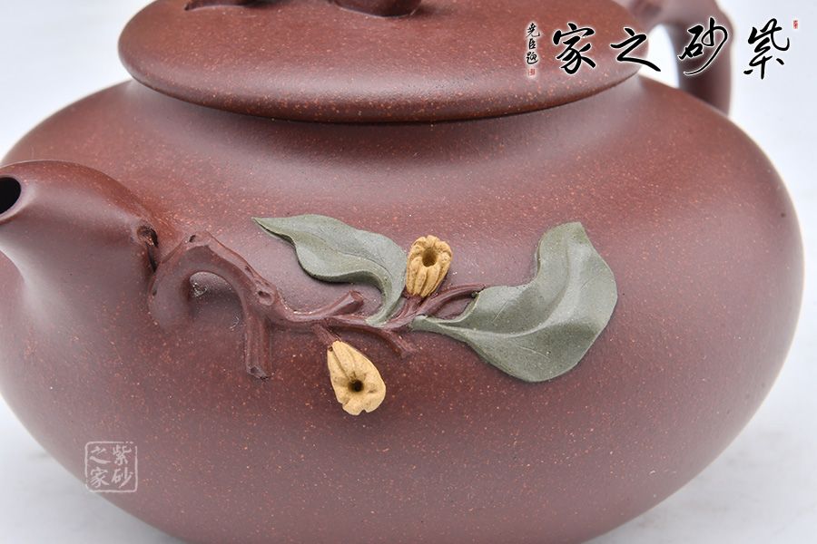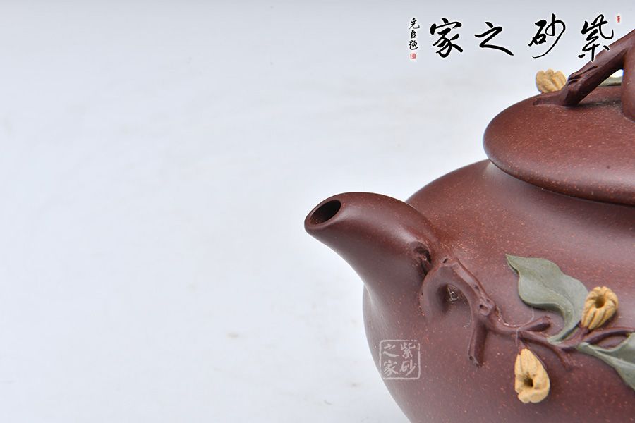 此壺壺身飽滿,線條流暢,比例得當(dāng),大口蓋,大氣十足。更是在外撇的壺嘴與闊闊的耳形壺把的襯托下,整款壺力蘊(yùn)十足,仿若氣沉丹田,亟待蓬勃而出。壺身佛手裝飾,禪意十足,也彰顯了范老師自己獨(dú)特的風(fēng)格,值得收藏。