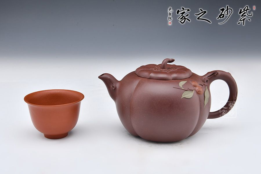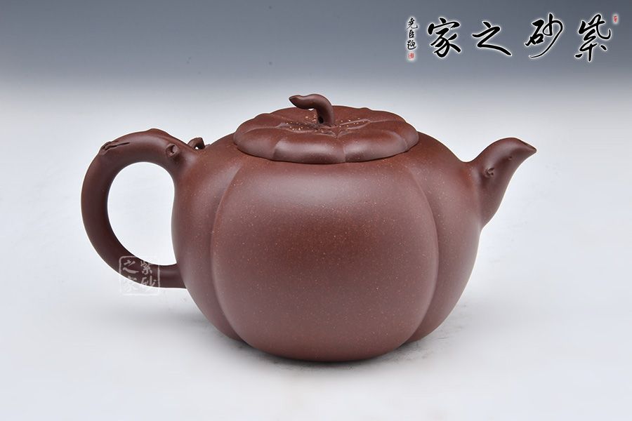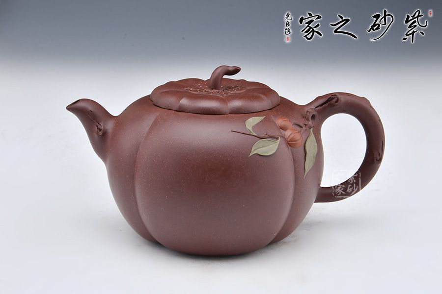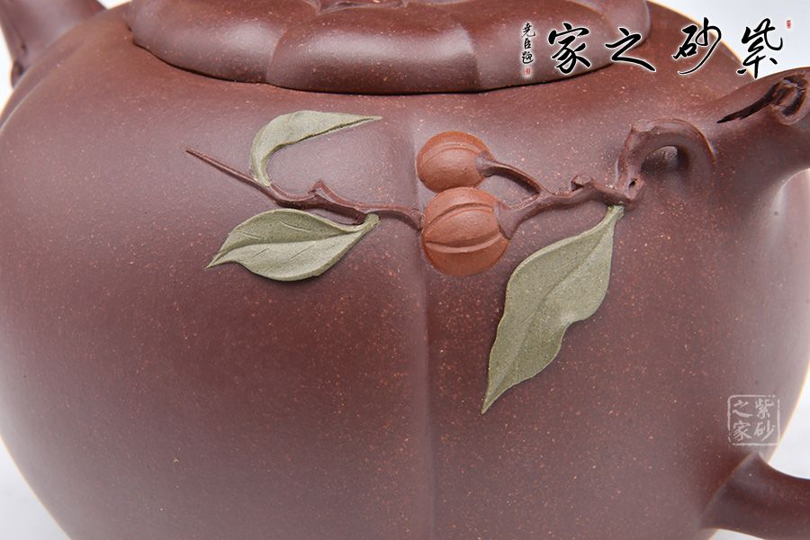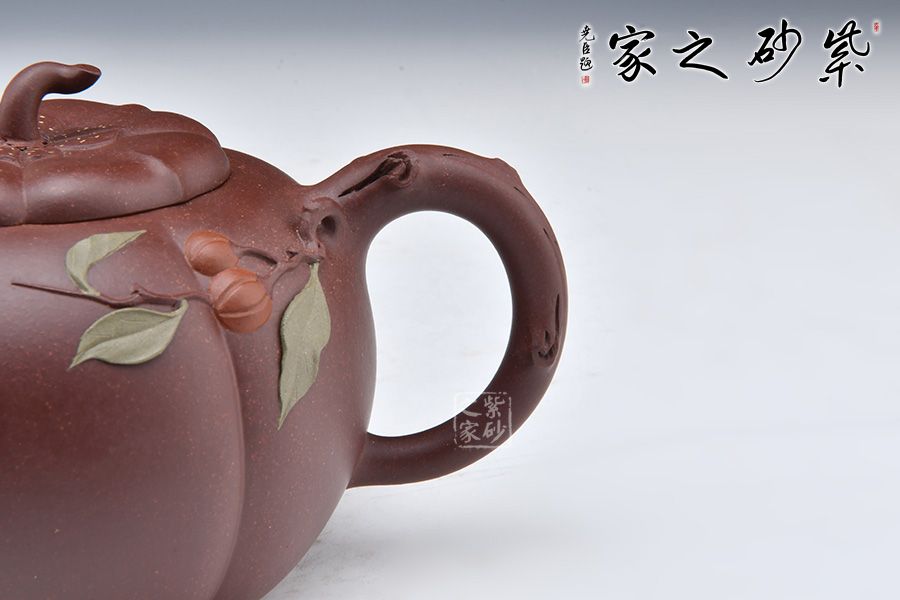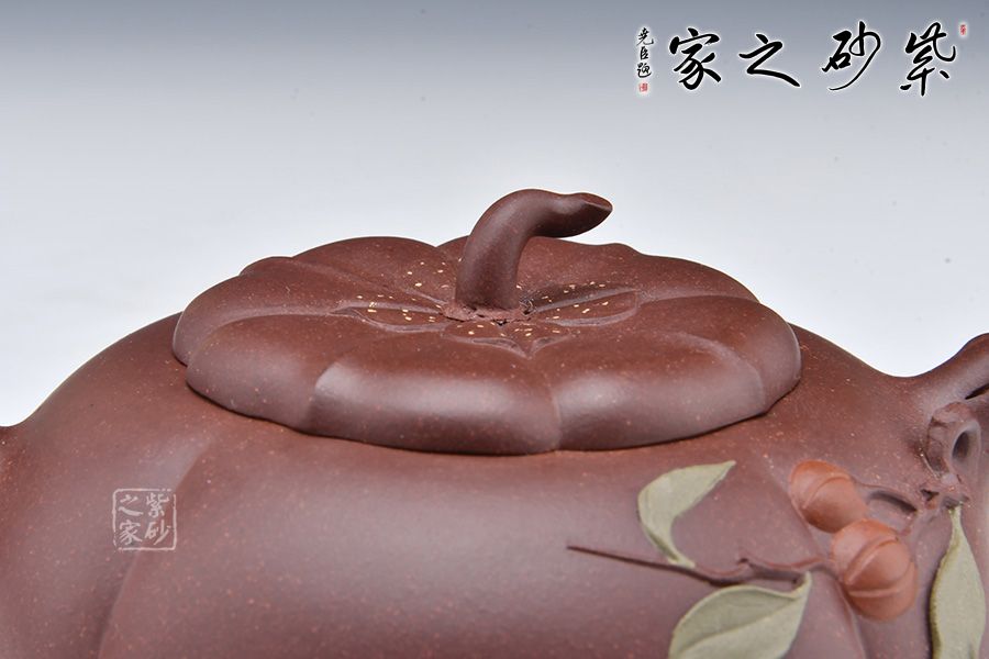 此壺似一只剛剛成熟蒂落的柿子,外形豐潤飽滿,仿佛裝滿了厚實的果肉。壺身以豎線條裝飾出筋紋,豐富了柿子的表現(xiàn)力。壺鈕如柿子蒂,彎轉(zhuǎn)自如,柿葉柿子貼塑于壺身,生動逼真。