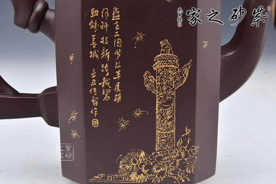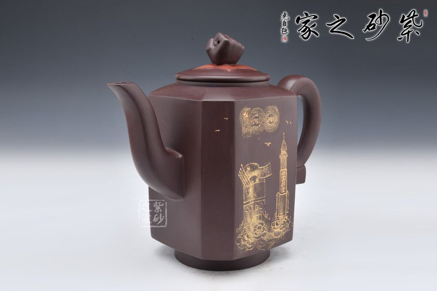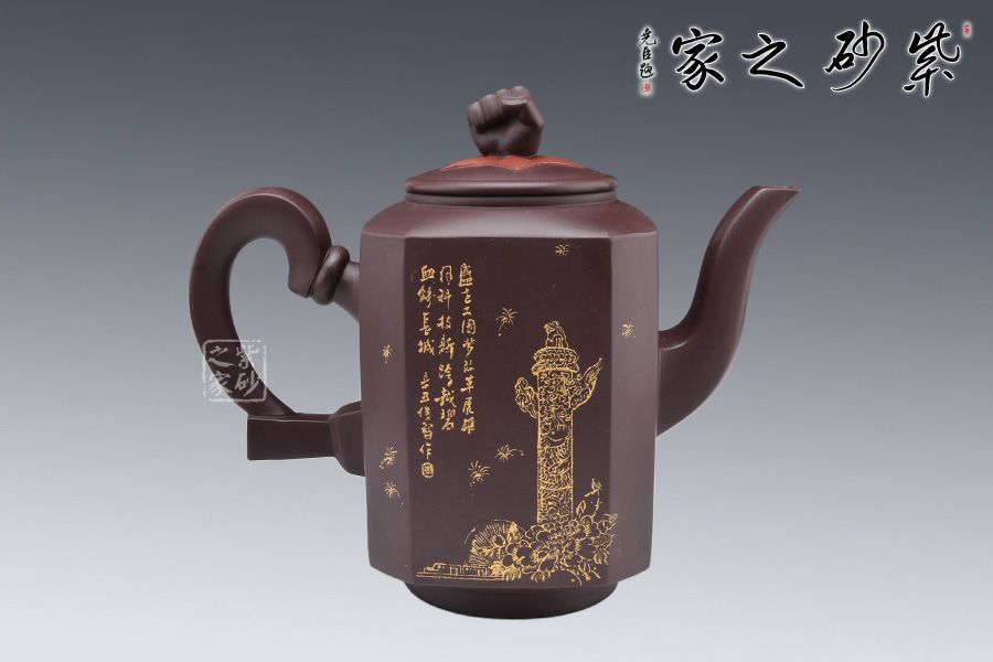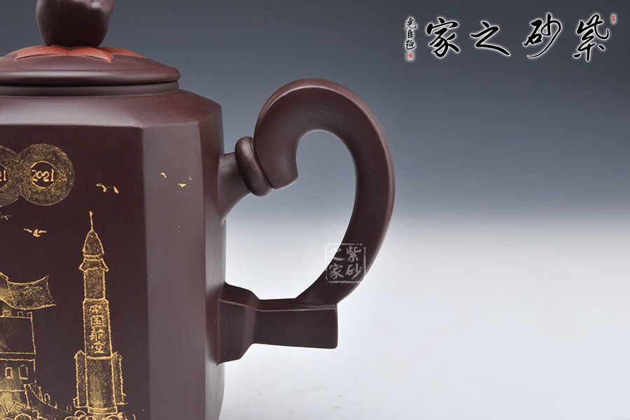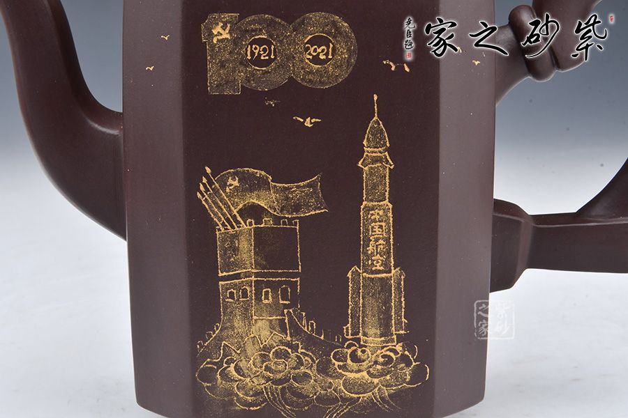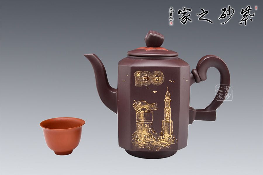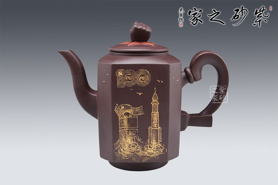 此壺是曹競(jìng)方老師為紀(jì)念百年大黨所制,造型充盈飽滿、線條流暢、富有張力。壺身上黨旗飛揚(yáng),壺鈕為一拳頭,鏗鏘有力的體現(xiàn)了中國(guó)共產(chǎn)黨全心全意為人民服務(wù)的根本宗旨,并把實(shí)現(xiàn)人民群眾對(duì)美好生活的向往作為奮斗目標(biāo)。