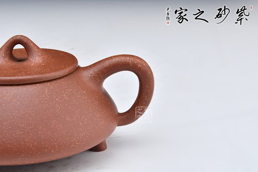 此壺器型古拙,線面簡(jiǎn)潔明快,還不失沉穩(wěn)大度,壺身沿襲古老方法上小下大,使重心下垂,使用起來更穩(wěn)當(dāng),壺嘴采用短而有力的直筒形,出水的力度更加佳,使用暗接手法與壺身相連銜接不落痕跡,壺鈕如同一條拋物線連接壺蓋兩端,形如拱橋。三足底支撐,使整器更加挺拔,引人矚目。