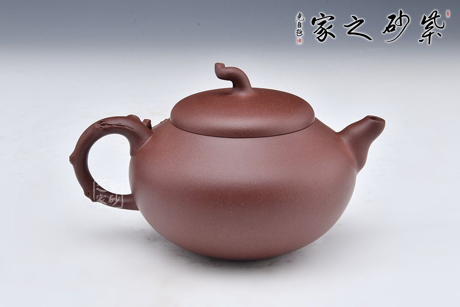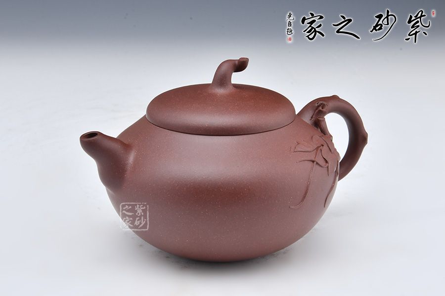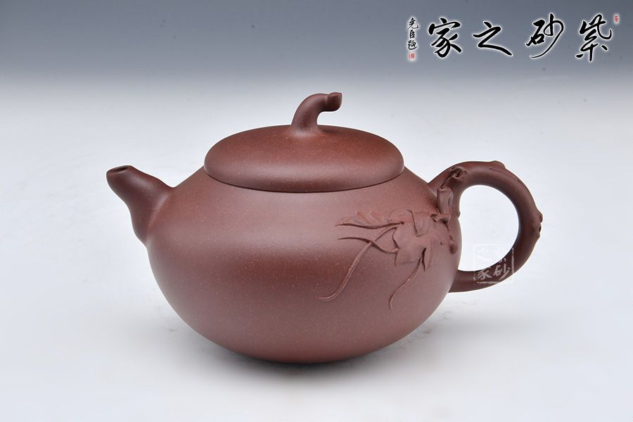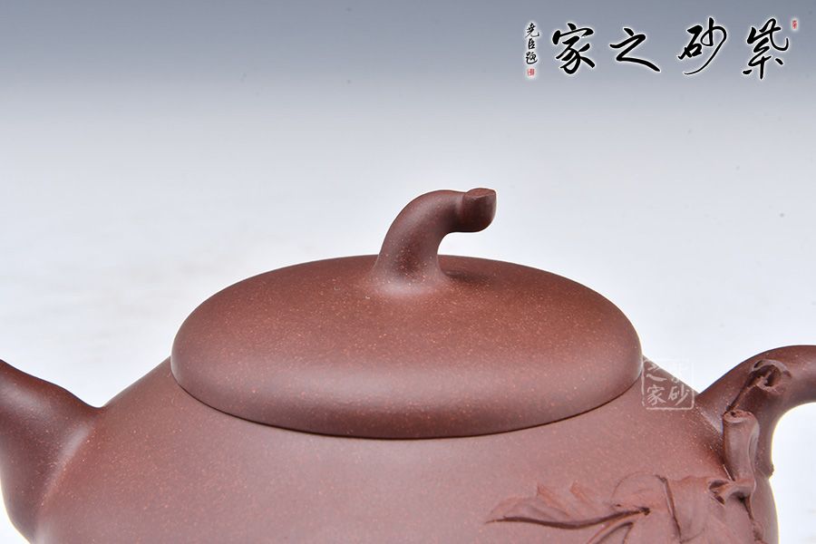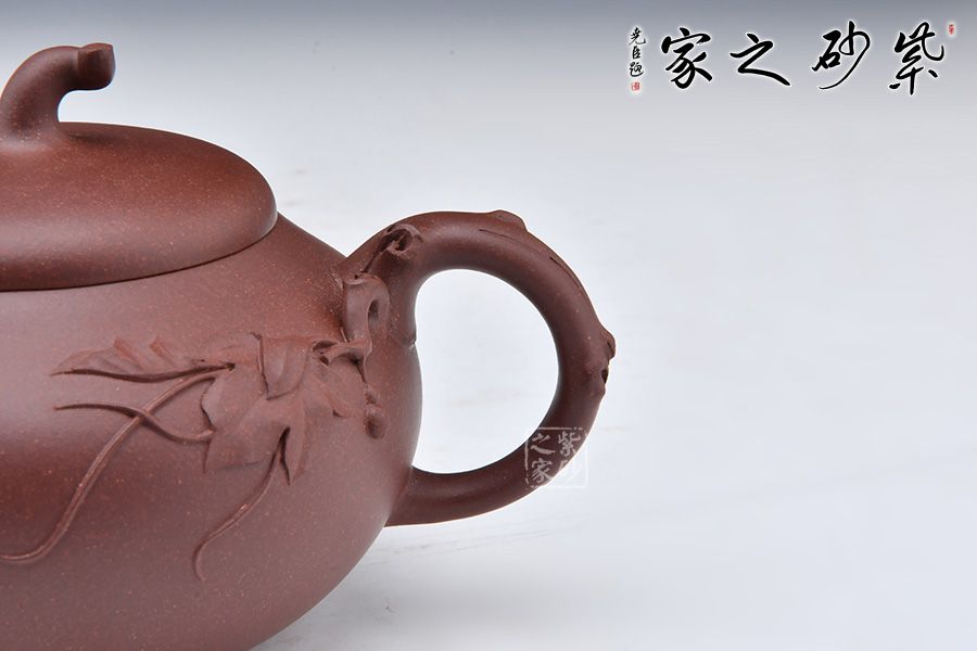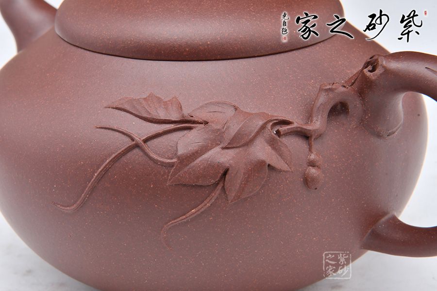 此款葫蘆作品與其他葫蘆壺相比有些特別之處,壺身飽滿,壺鈕以瓜蒂為型,壺把以一葫蘆藤為裝飾,葫蘆葉延伸至壺身,增添了自然氣息,推薦收藏!