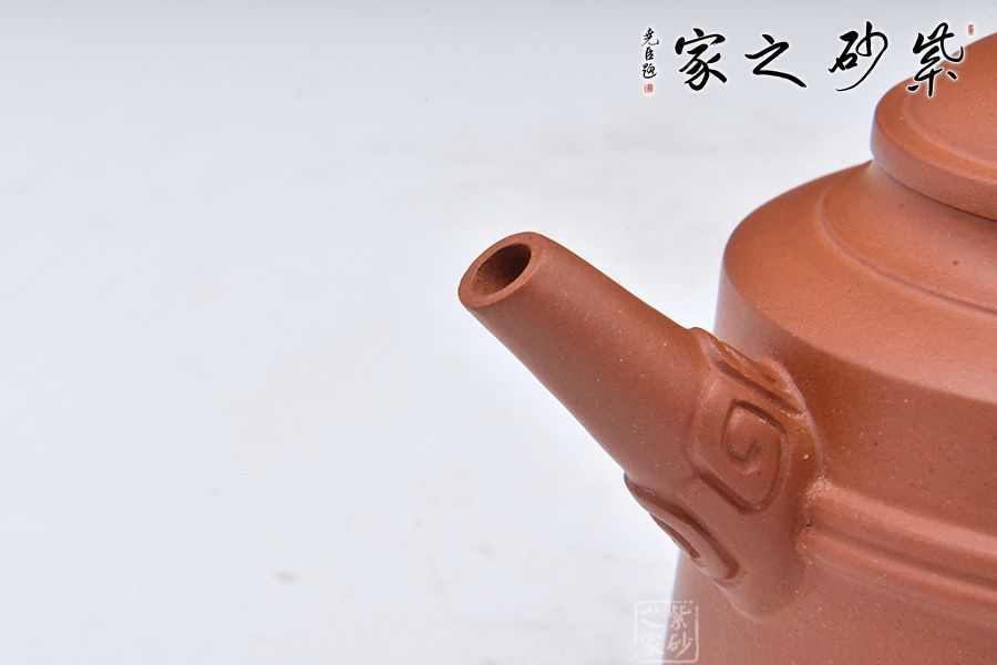 此壺整體是漢代編鐘的造型,螭龍作壺把,青銅紋樣裝飾壺嘴,兩條圓潤厚重的線條把壺連成一體,使壺的張力發(fā)揮的淋漓盡致,漢唐之風撲面而來。曹競方老師選用陳腐多年的上等黃龍山原礦清水泥制作此壺,壺身顆粒隱現(xiàn),肌理勻稱,金砂閃爍,層次分明。
