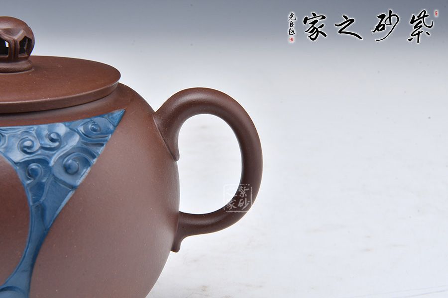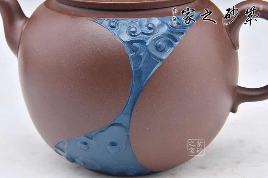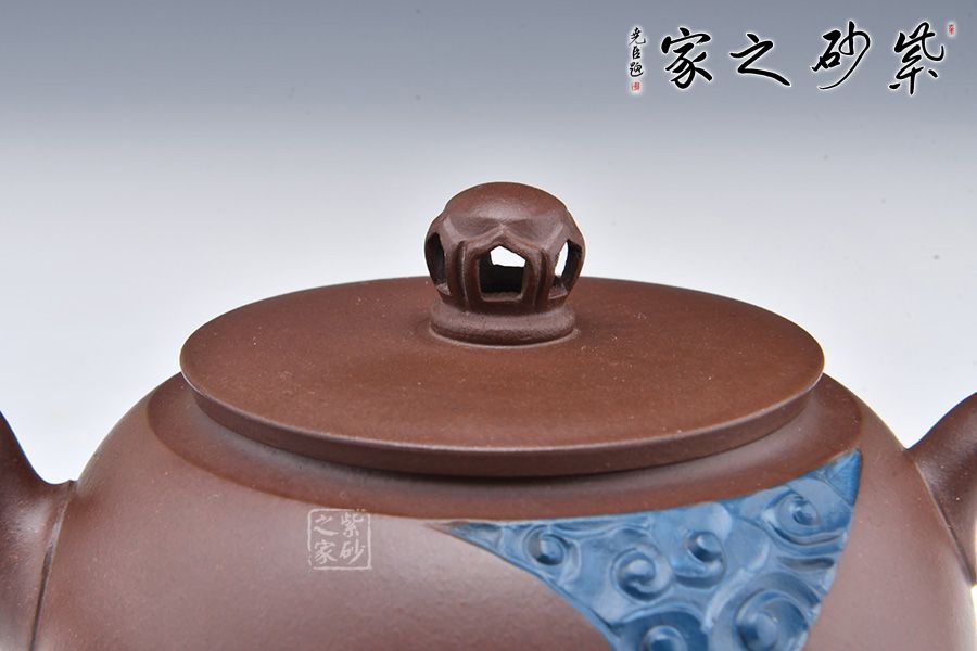 此壺由原礦紫泥制作而成,色澤素雅。鏤空壺鈕,工藝精湛,壺身祥云裝飾,觀賞性極佳,表現(xiàn)了作者青云直上的美好愿力,是一件不可多得的好運(yùn)之壺。
