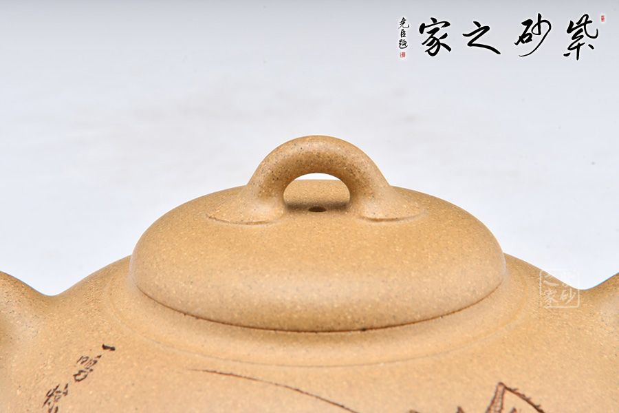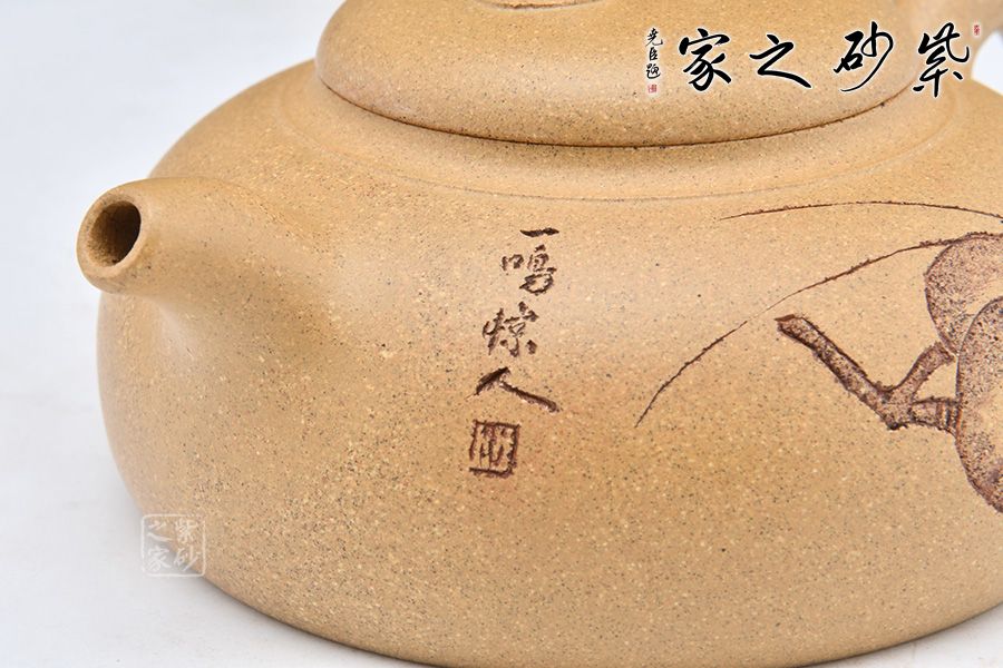 此壺壺體微扁,氣韻貫通,扁而不塌,對老師的技藝要求較高。壺嘴壺把相對應(yīng),橋型壺鈕拿取方便。