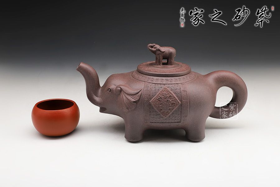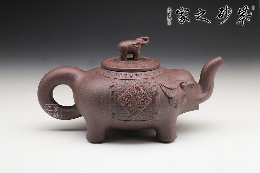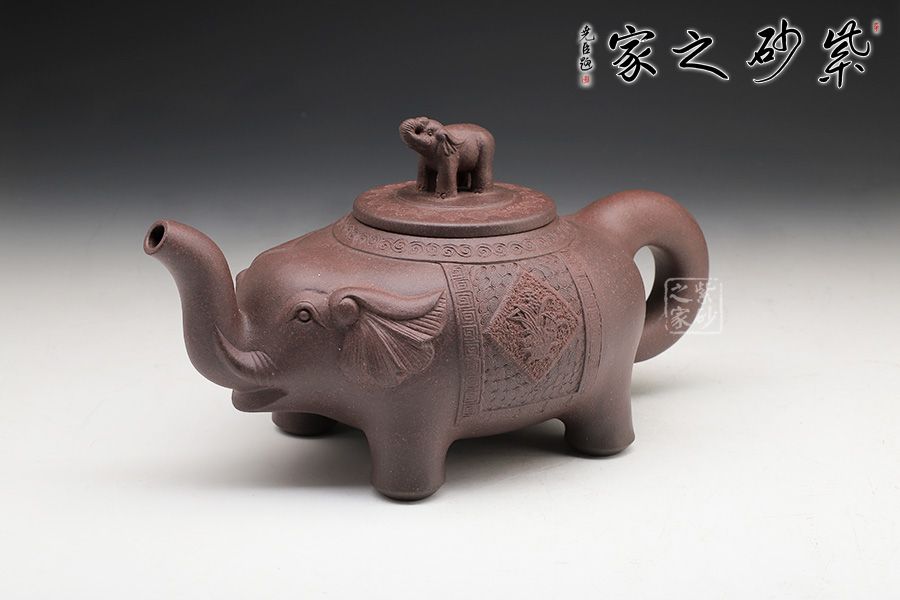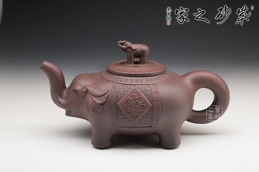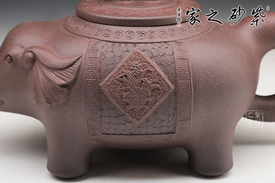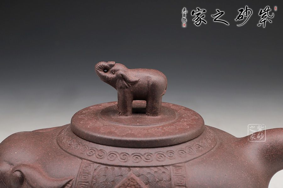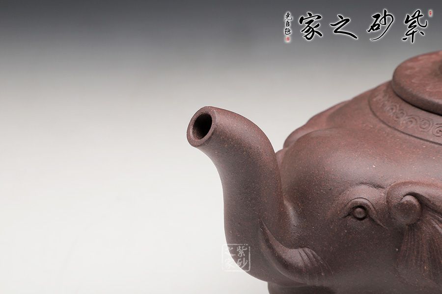 此壺以象為壺形,象尾為壺柄,象鼻為壺嘴,身軀豐碩,自成壺體,四肢粗壯為四足。壺鈕為一小象,造型天真與壺體呼應。整器取材自然,返璞歸真!