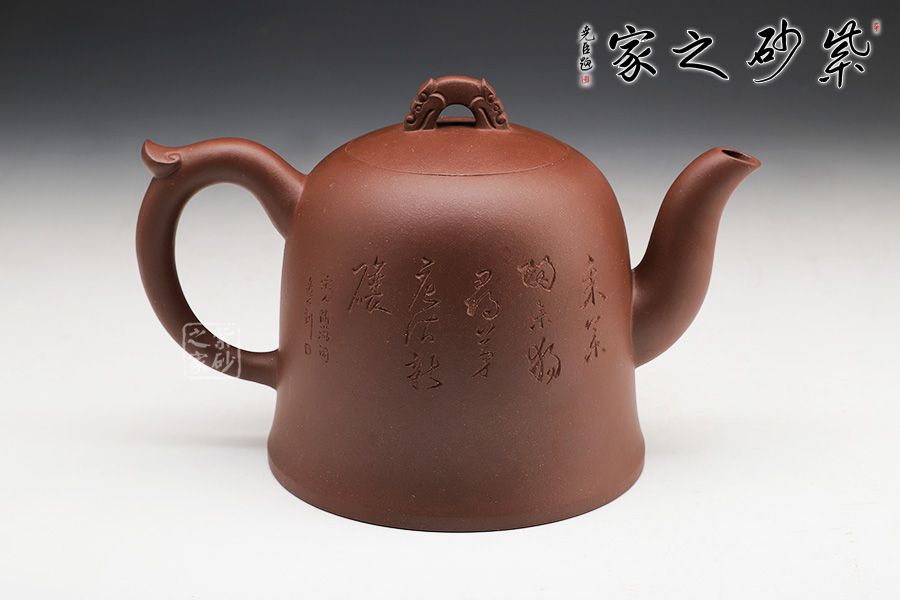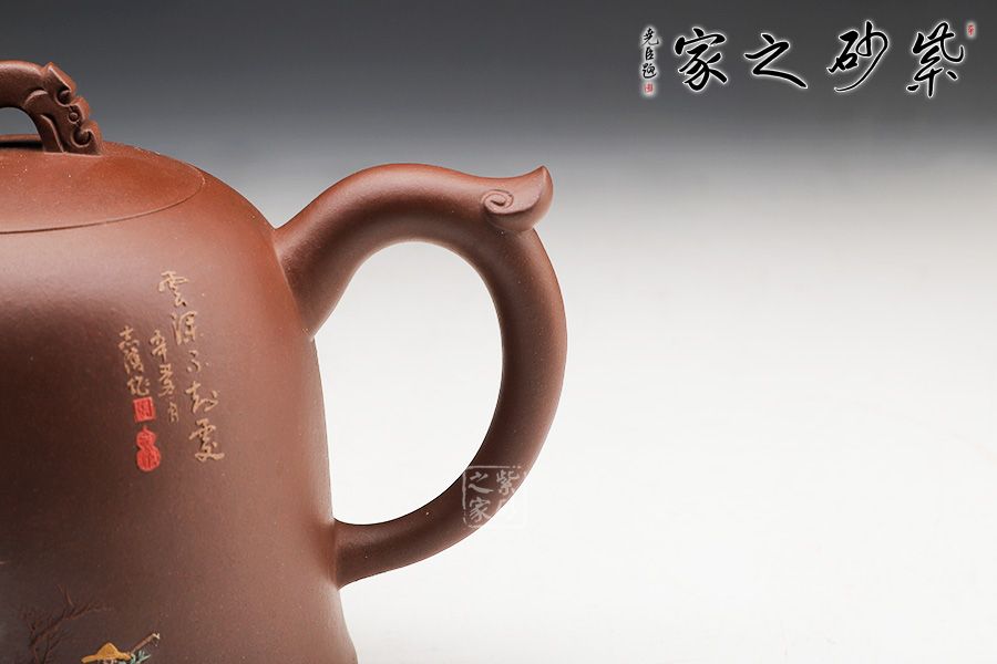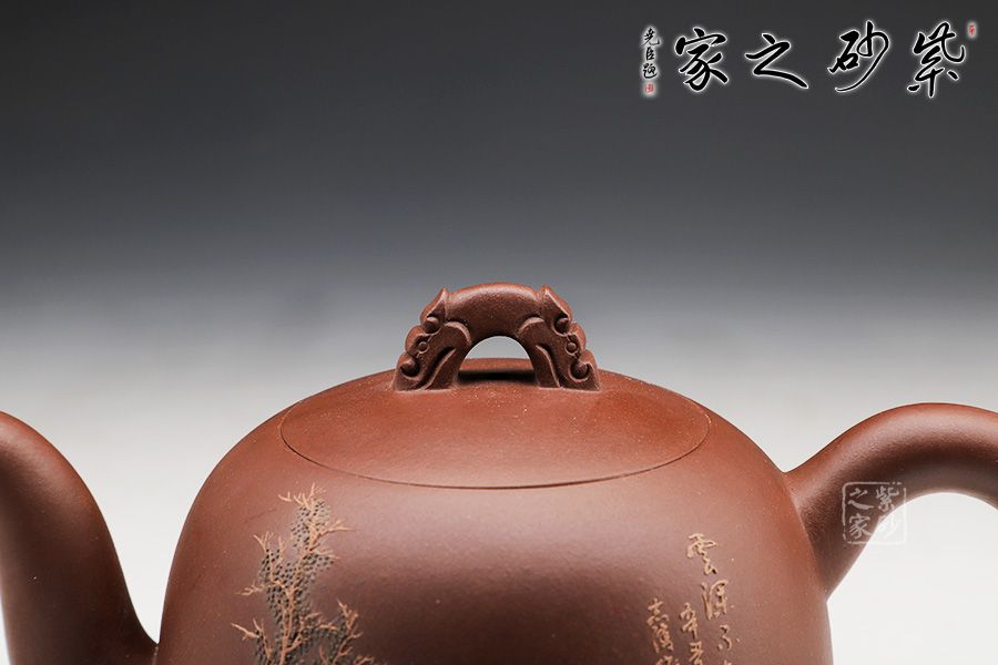 此壺壺型大氣磅礴,古雅卓絕,古典脫俗。橋型龍紋壺鈕,古樸黯然且方便拿捏。截蓋設計與壺身渾然一體,壺肩及蓋面順勢而下簡約古雅,壺基豐厚,憨態(tài)十足。飛把設計,上下跨度較大,端握寬和體貼。