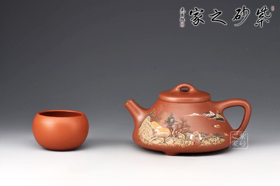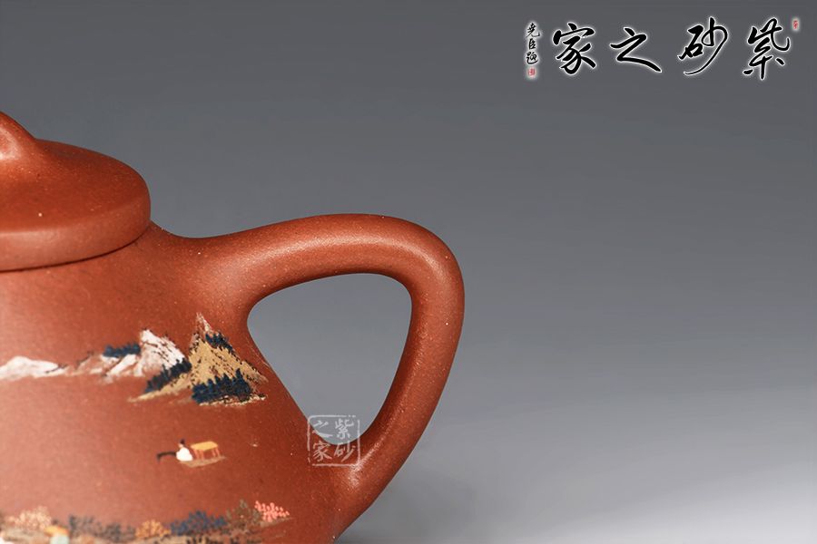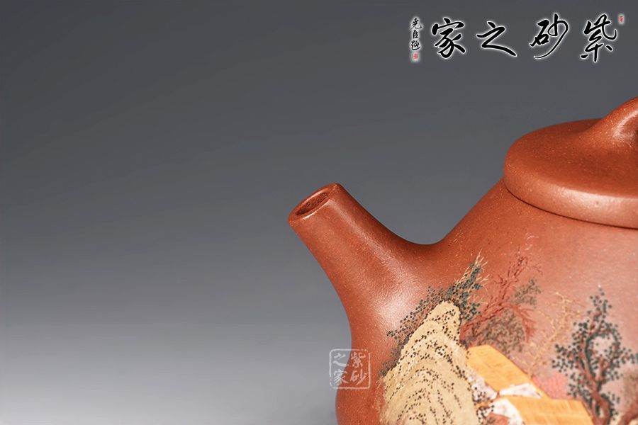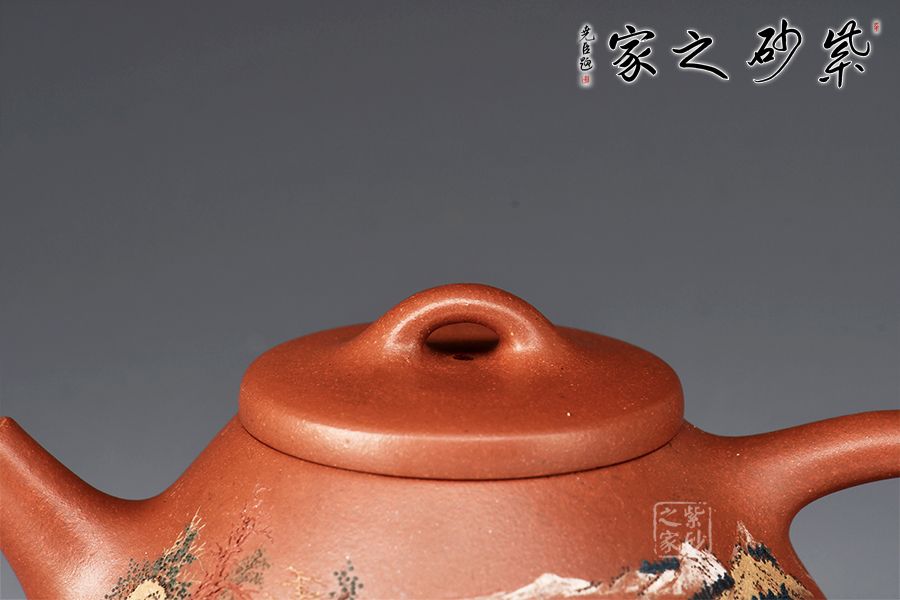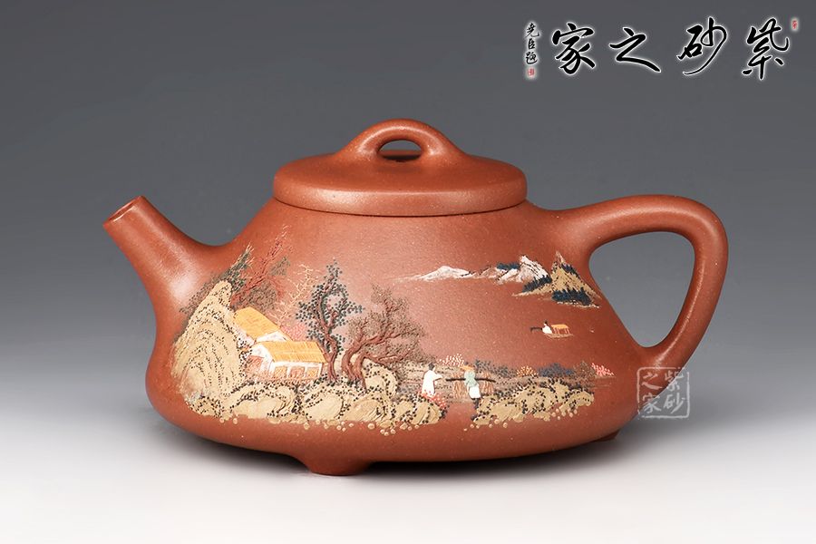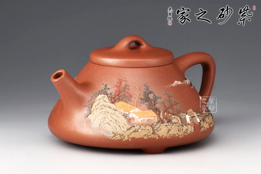 此石瓢壺器型規(guī)整,暗接直流挺翹,出、斷水迅捷。截蓋嚴(yán)絲合縫,氣密性極佳。橋鈕比例適當(dāng),拿捏適手。倒三角壺把,便于把執(zhí)。壺身泥繪山水人家,用色貼切、深淺層次分明,注重意境深邃,畫境優(yōu)美。