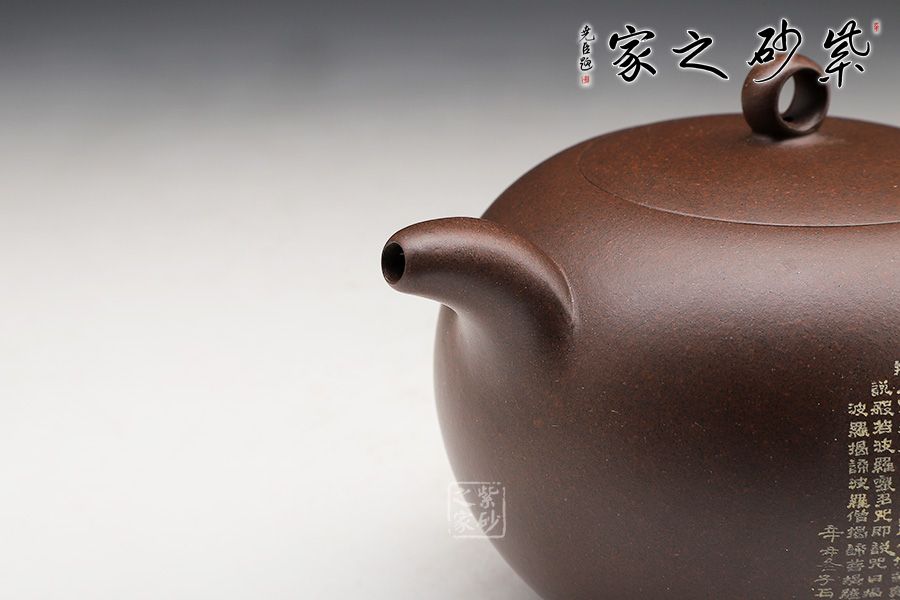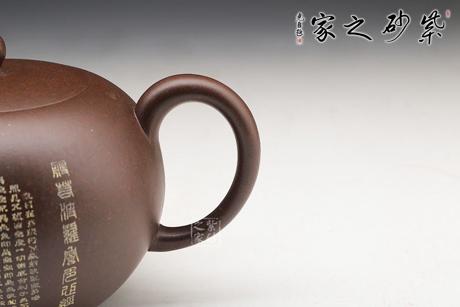 此壺造型古樸,古韻盎然,莊重又不乏新意,典雅大氣又不失陽剛之氣,惹人喜愛,使人清心安靜,洗滌塵間煩躁的心情。一彎壺流自然胥出,渾厚飽滿,形成嬌憨可愛的氣韻。耳形壺把,比例均衡,拿捏有力。