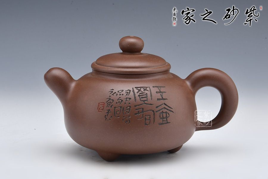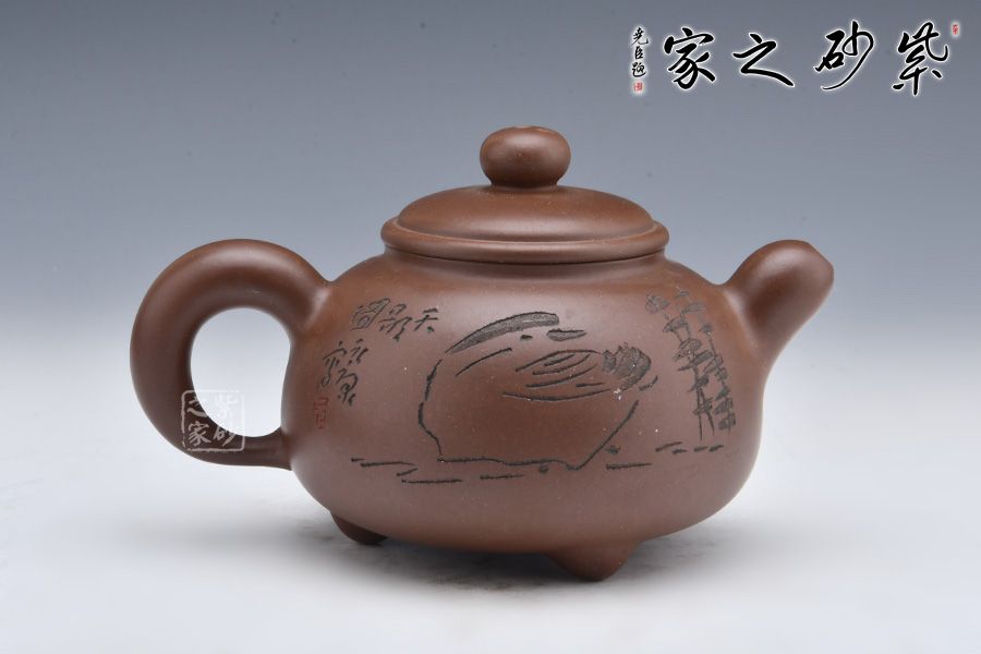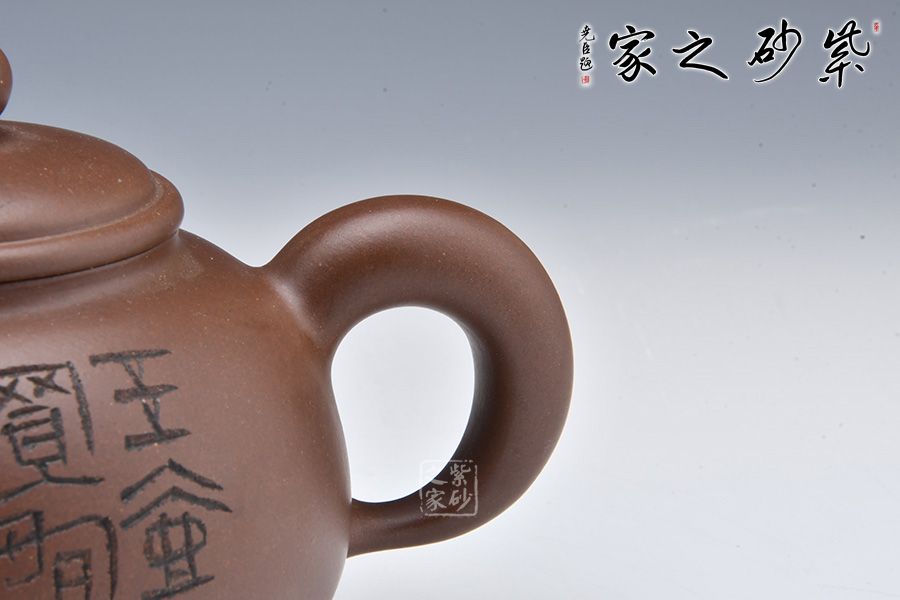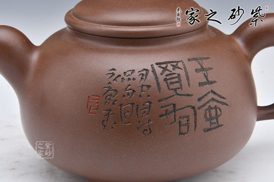整壺稀有泥料文革老紫泥制作,總量極少,可遇不可求。壺身豐厚飽滿,以夸張的手法設計壺嘴、把及壺鈕,顯得格外憨厚可愛,增添趣味性的同時又不失實用性。壺身查元康刻繪“玉壺買春”,整壺造型古樸端莊,氣度不凡,充分展示了作者精妙絕倫的制壺技藝。