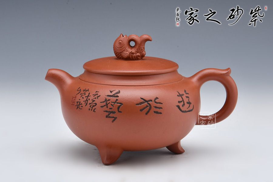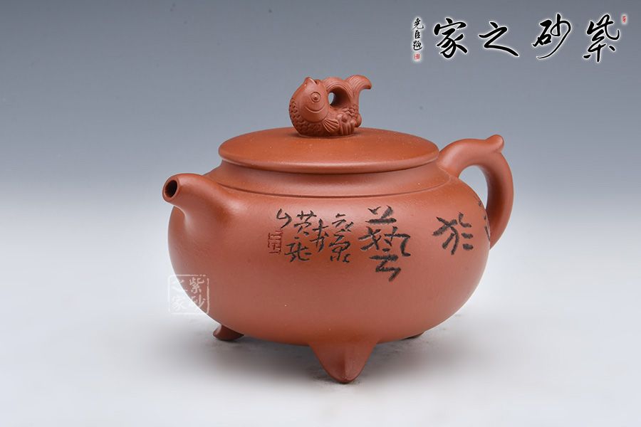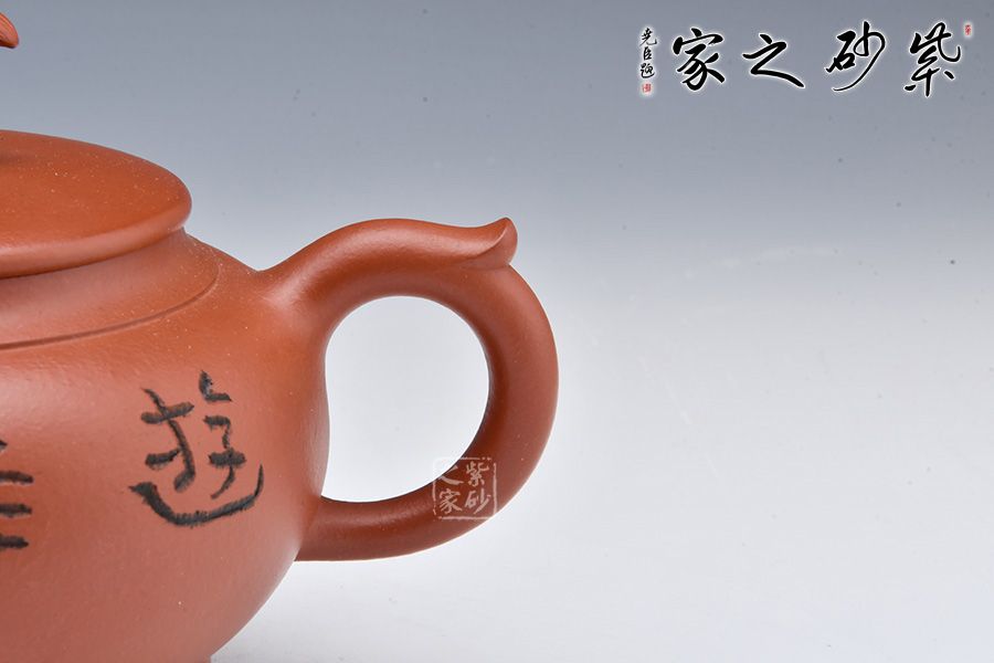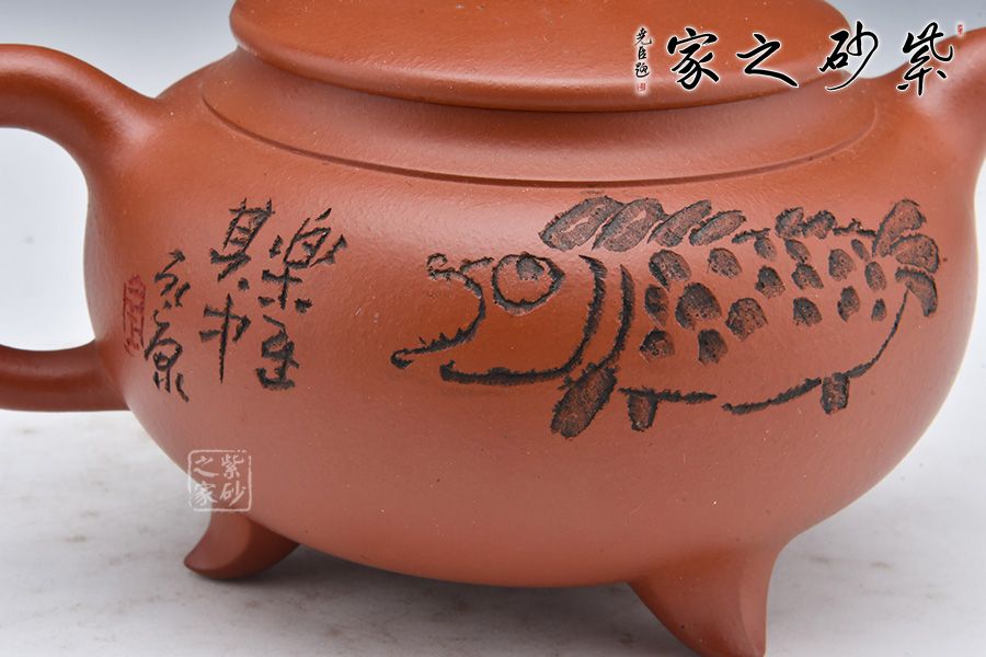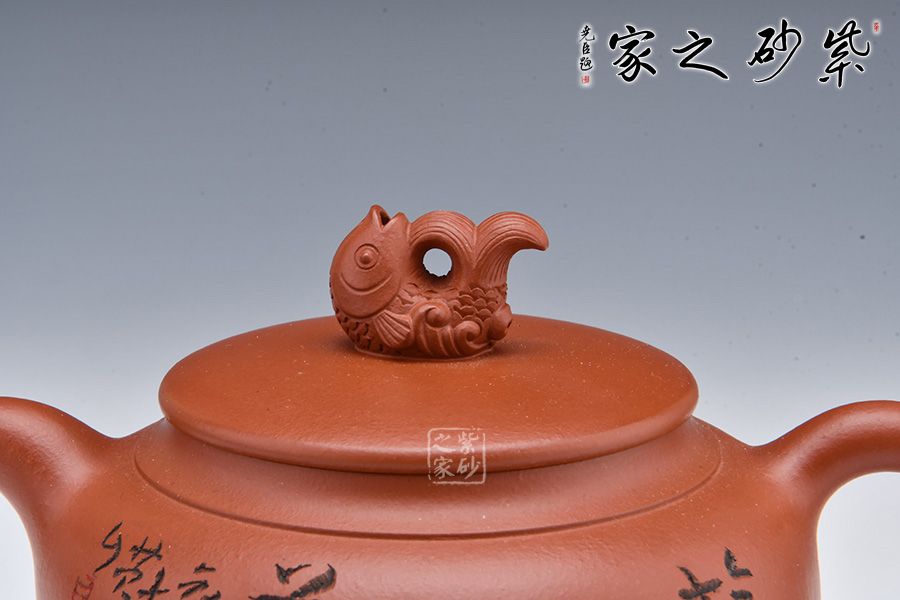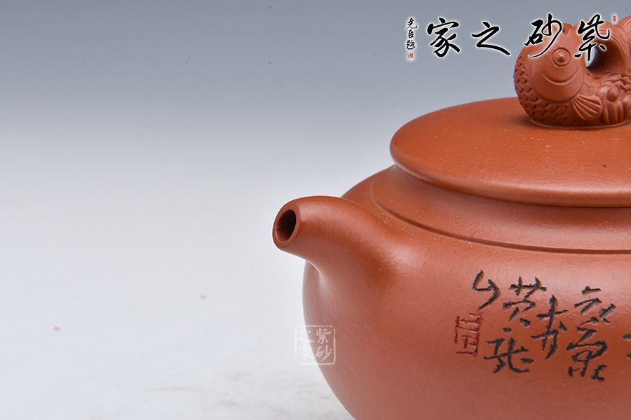 壺身飽滿圓潤,線條流暢。平蓋嚴(yán)絲合縫,大口蓋方面泡茶,十分實(shí)用。壺鈕點(diǎn)名壺意,鈕以魚為形,栩栩如生,“魚”是“余”的諧音,皆是中國傳統(tǒng)吉祥祈福最具代表的語言之一,它代表生活富足,每年都有多余的財富及食糧。壺嘴、壺把暗接壺身,一彎嘴出水爽利,飛把拿捏舒適。