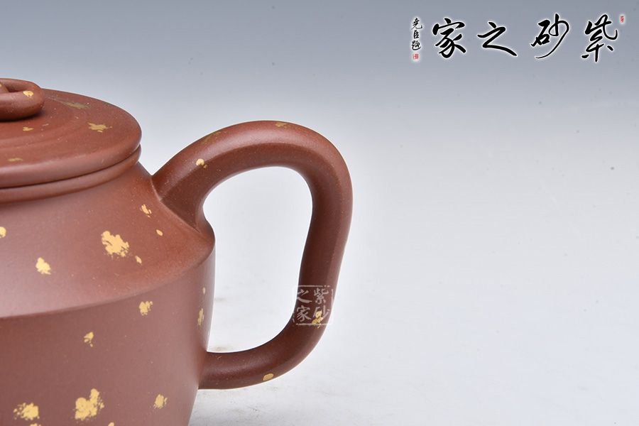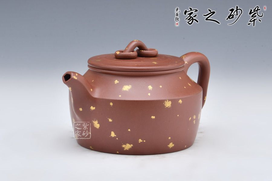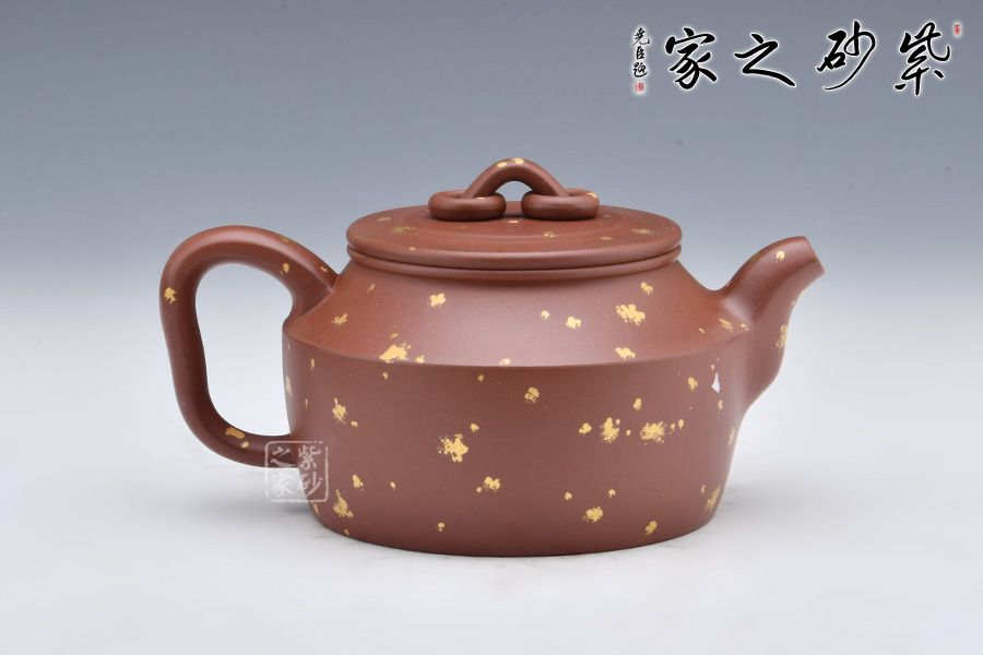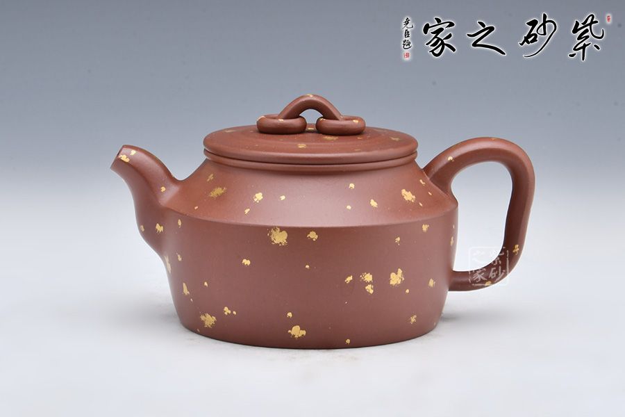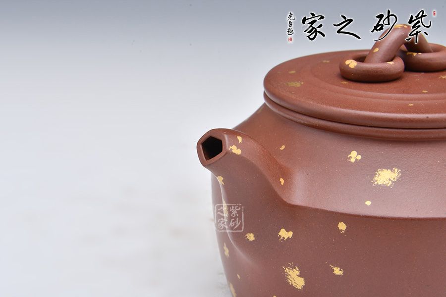 壺體扁圓敦厚,平蓋闊朗,線條簡(jiǎn)潔,爽利大方。把壺嘴暗接壺身,四方造型,更添韻味。壓蓋設(shè)計(jì),嚴(yán)絲合縫。壺鈕乃點(diǎn)睛之筆,裝飾兩個(gè)環(huán)形,制作難度極高。整壺灑金裝飾,星星點(diǎn)點(diǎn),貴氣十足。文革老紫泥制壺,紅潤(rùn)細(xì)膩,品茗賞壺,真真可說(shuō)是活色生香也。