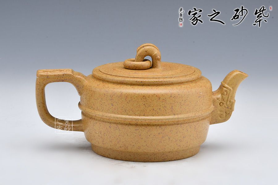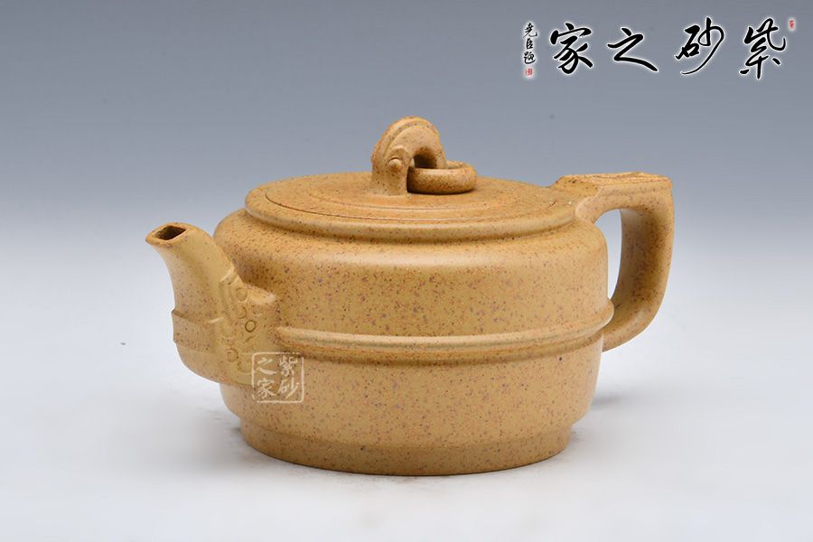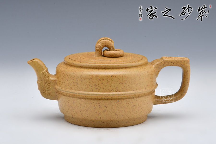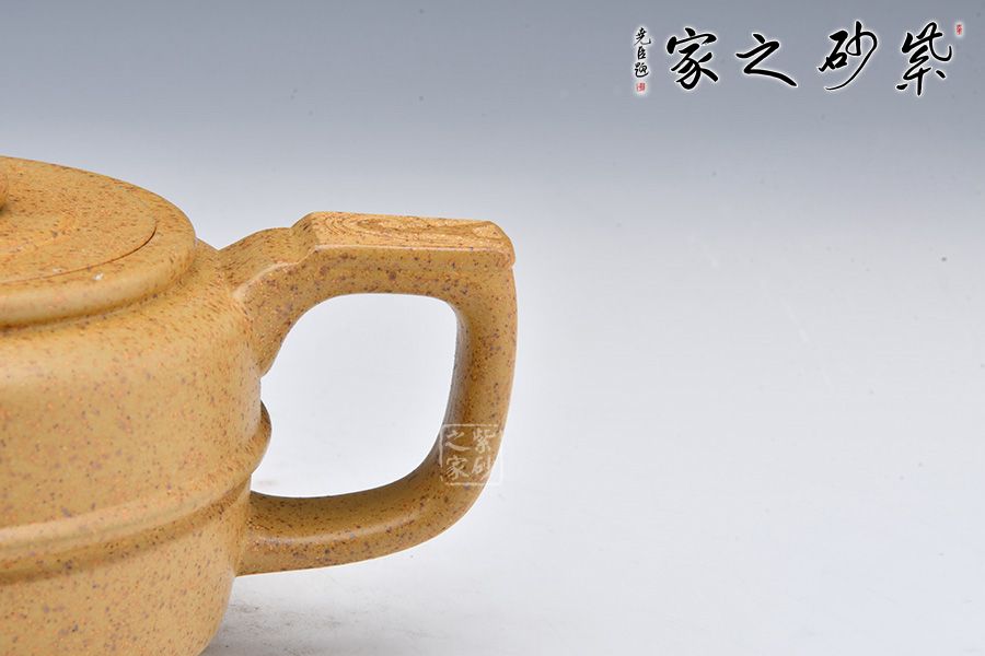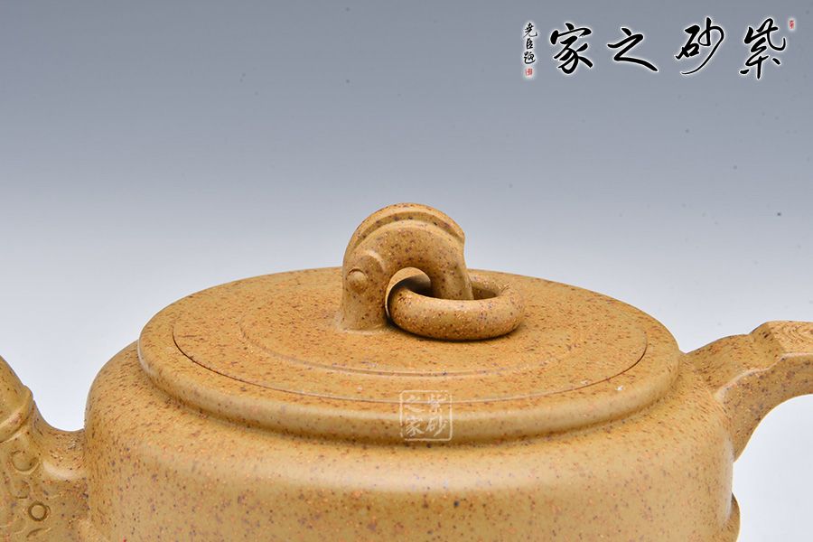 整壺選用了黃金段制作而成,泥料稀少而珍貴,點(diǎn)、線、面巧妙合理。壺身在圓筒形基調(diào)上修飾而成,壺以玉為題,故名“集玉”。壺身為扁圓柱形,似用兩大玉璧疊合組成,壺腰用玉飾紋凹凸線分界,束出壺身骨秀神清之姿。肩腹用弧線交接,底足用兩條直角線階梯收縮,烘托出壺體剛健婀娜之態(tài);壺嘴方形,三彎流嘴,方圓結(jié)合,以龍首裝飾,設(shè)計(jì)別致;壺把上方下圓,雕花猶如古時(shí)窗戶的雕花一般精美古拙;壺蓋形似圓璧,蓋紐飾環(huán),玉魚拱形,整體裝飾和諧協(xié)調(diào),瑩潔圓潤,韻味雋永,格調(diào)高雅。
