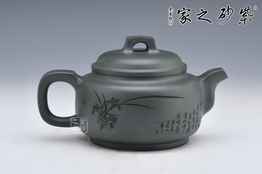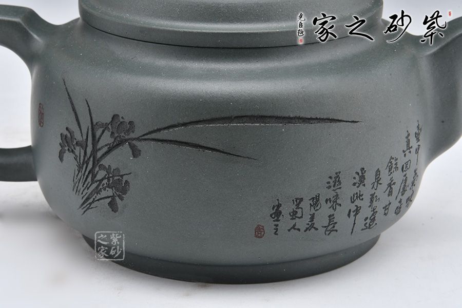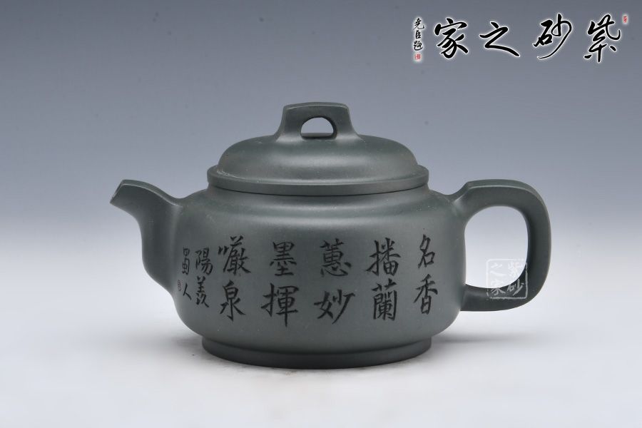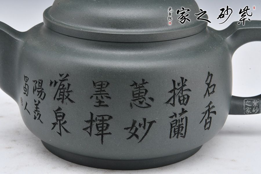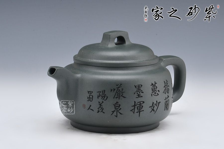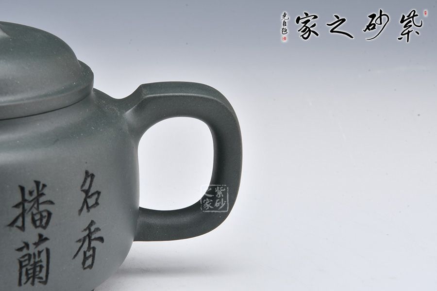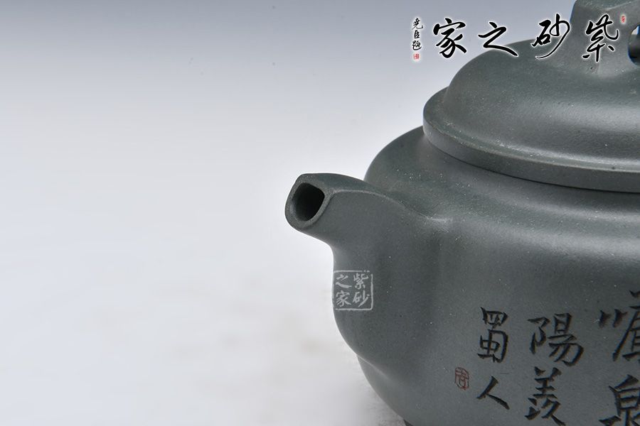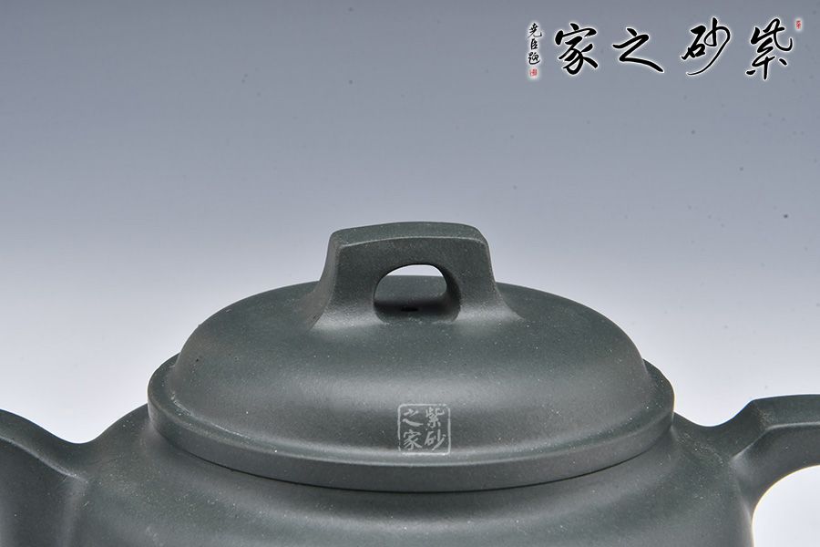 采用民國老綠泥制作而成,泥色亮麗清新。整壺圓潤,加入圈底,敦厚大氣;壺鈕、壺把、壺嘴四方呈現(xiàn),線條清晰流暢,比例精準(zhǔn)。