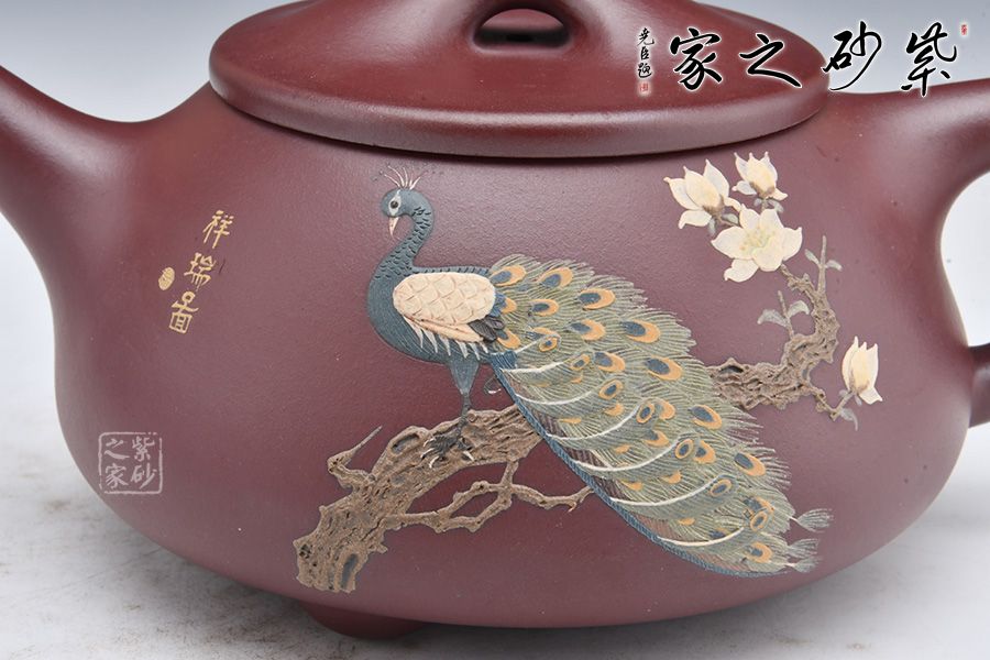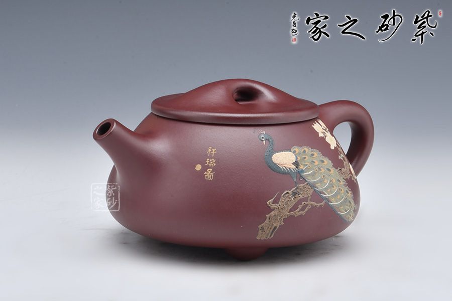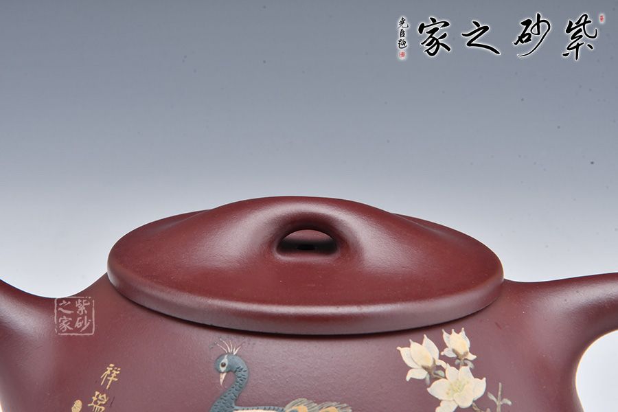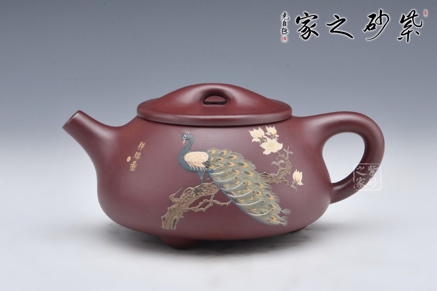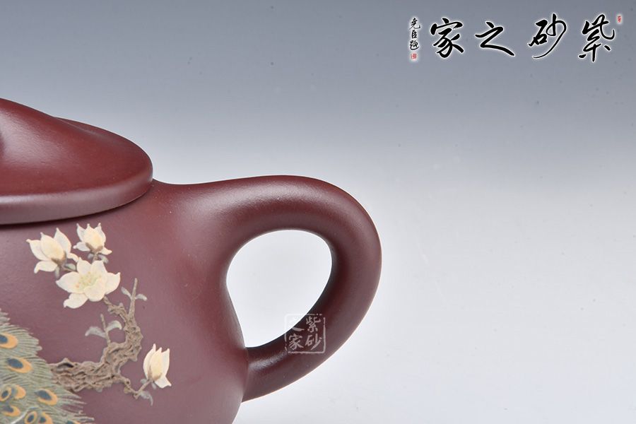 整壺采用稀有泥料金龍血制成,溫潤如玉,美不勝收!滿瓢壺要點在一個“滿”字,要氣滿、神足,此壺壺身呈金字塔形,平蓋闊朗大氣,橋鈕圓融大度,直流、三角把細微處見風(fēng)韻,敦厚古雅,周正穩(wěn)重。 此外,壺身加入泥繪工藝,一只孔雀立于枝頭,羽毛根根分明,細節(jié)十足。整壺古雅敦厚,大氣古樸,值得品賞收藏。