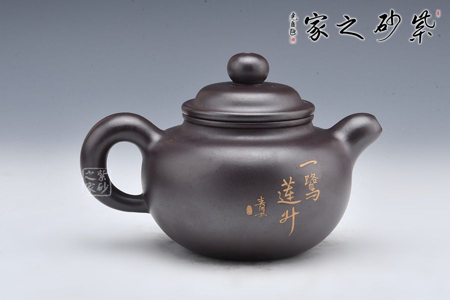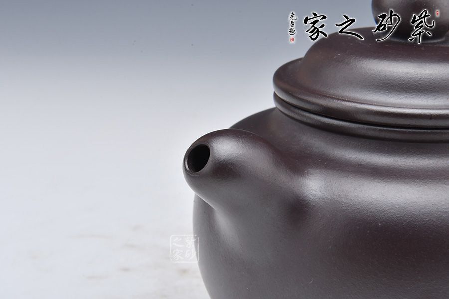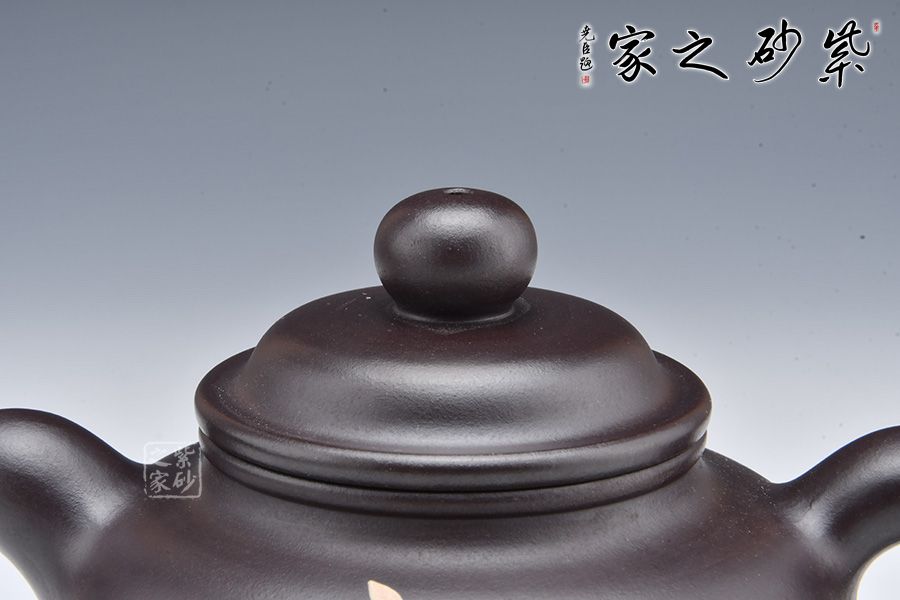 此壺摹古而作,以道洪蓮子為型,選用金龍血精制而成,泥質(zhì)細(xì)膩,明潤(rùn)雅致。整器承襲道洪之風(fēng)格,身、蓋、鈕、流、把渾厚大氣,線條流暢,遒勁豪邁,內(nèi)蘊(yùn)充沛。