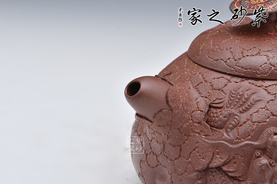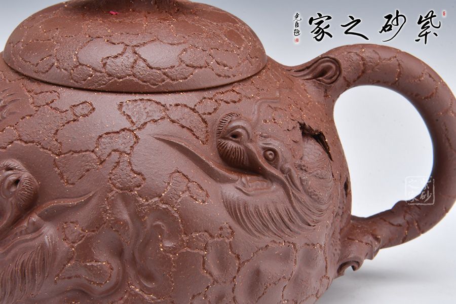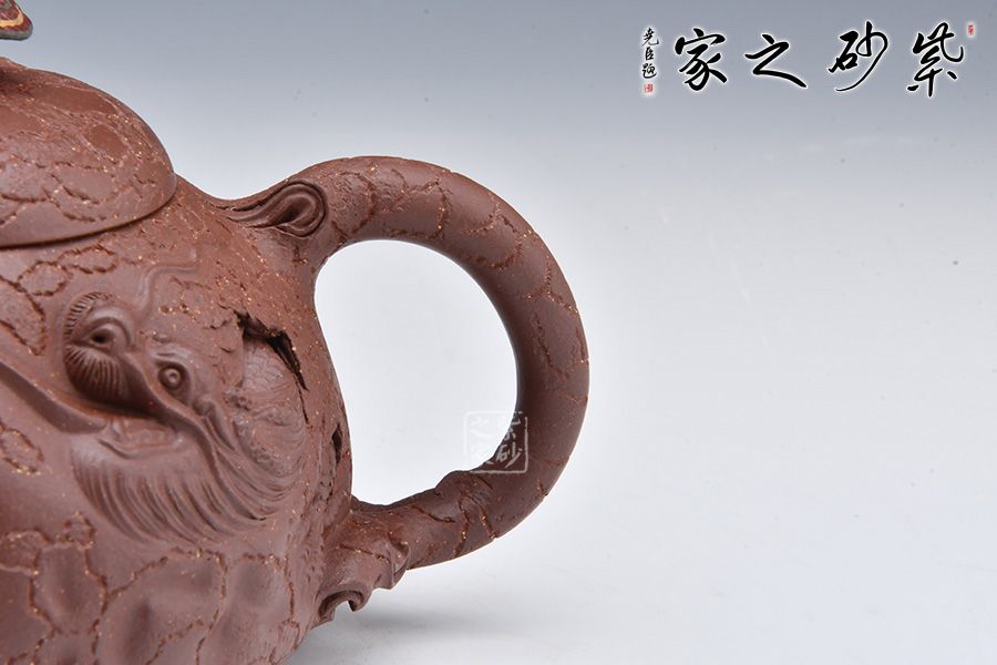 此壺與傳統(tǒng)的供春壺實有異曲同工之妙,壺身皆有如老樹疙瘩般,盡顯得老成,但此款作品壺身的疙瘩卻不同尋常,以浮雕龍首,寓意吉祥,典雅藝美。壺把與壺嘴粗大對稱,以靈芝為壺鈕不但突出主題,亦區(qū)分出與其他供春壺的不同,可見老師創(chuàng)意之新穎。整體造型渾圓敦厚,古樸雅拙,器身仿褶皺祥瑞,這款壺難能可貴,值得珍藏!