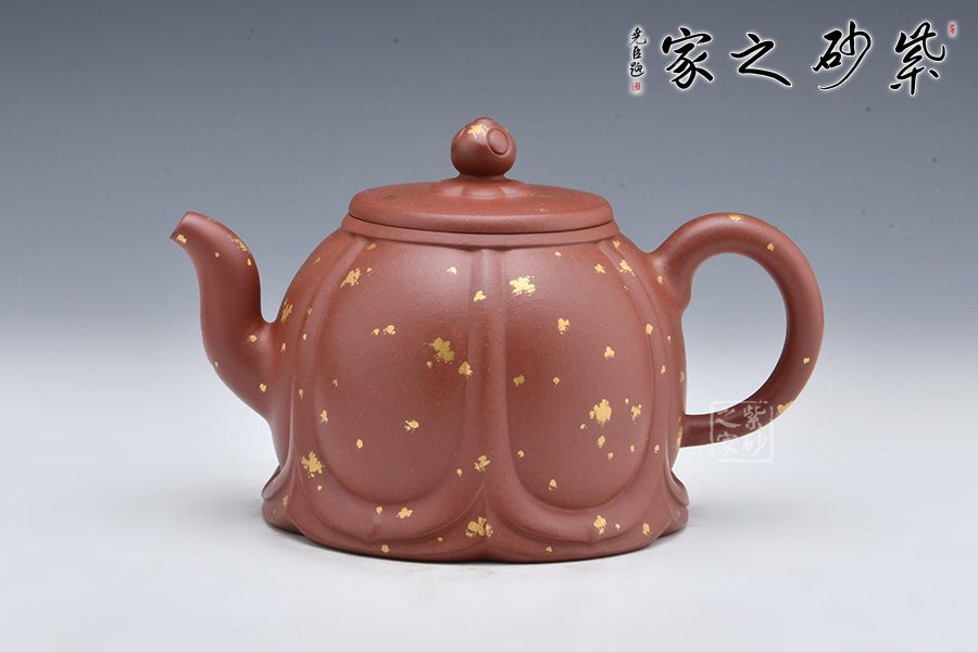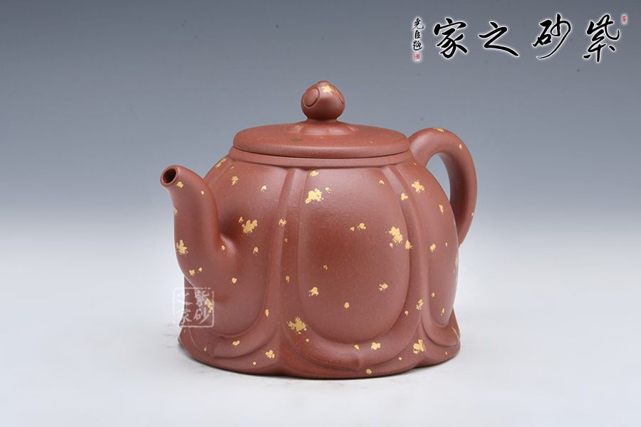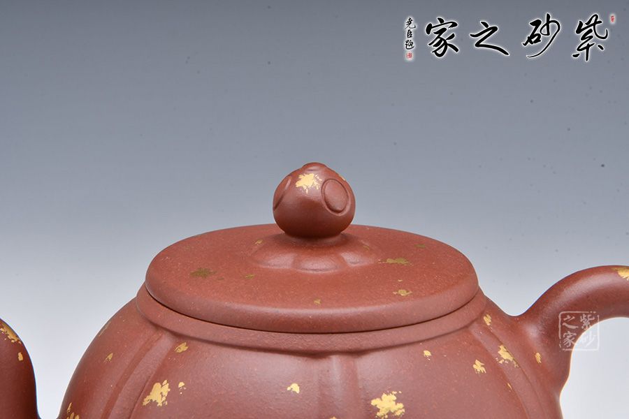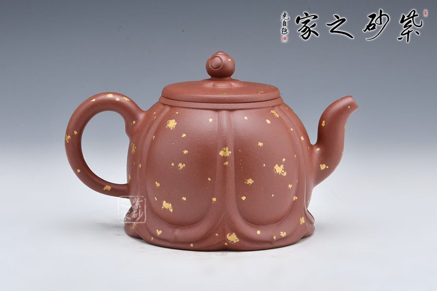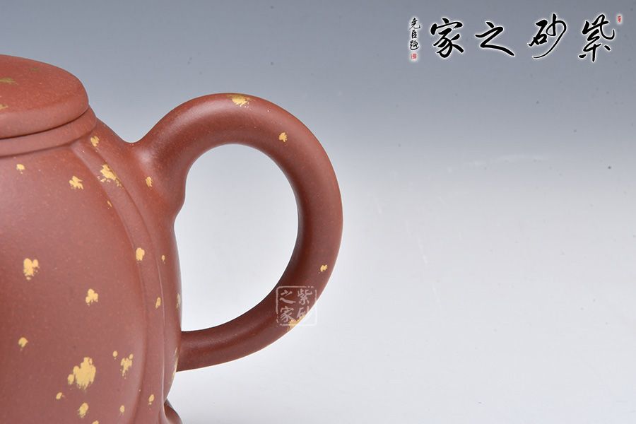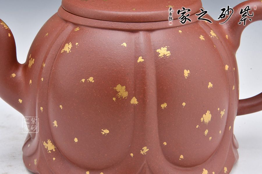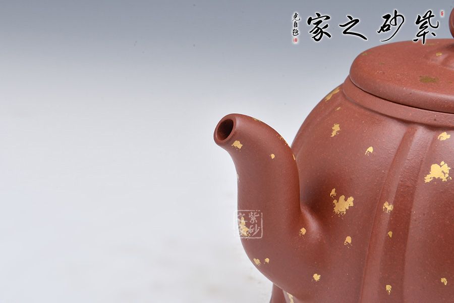 整壺老師選用原礦底槽清泥料為胎,泥料細膩,有光澤。壺身像一朵盛開的蓮花, 筋紋分割有序。三彎嘴出水流暢,耳把拿捏舒適。壓蓋設計嚴絲合縫,如意紋壺鈕,小巧可愛。壺身鋪砂工藝裝飾,星星點點,貴氣十足。