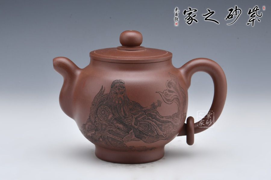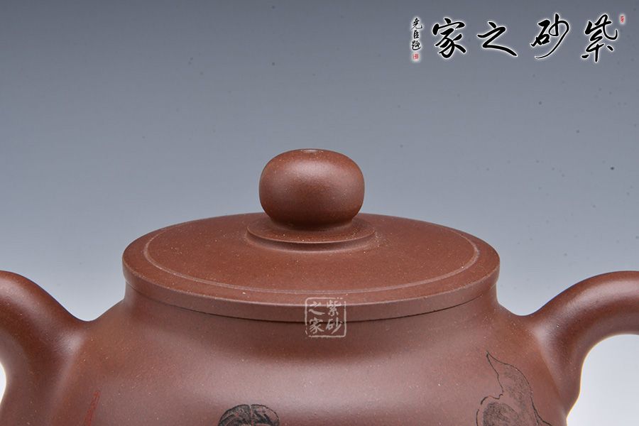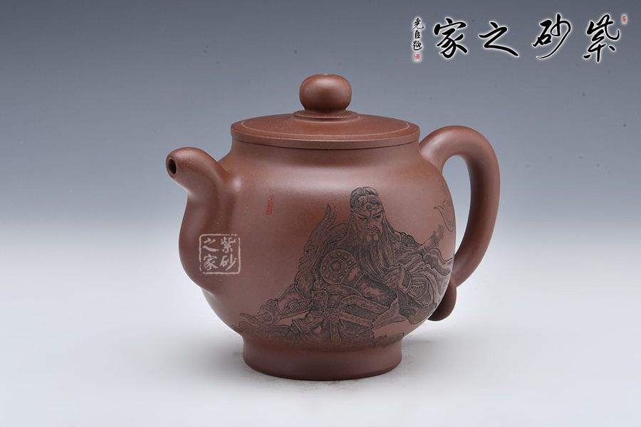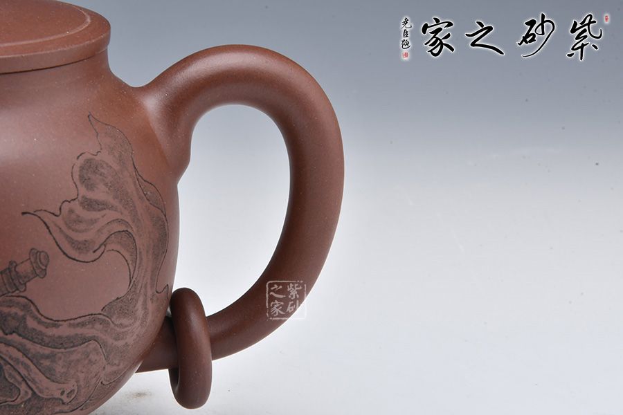 整壺采用老紫泥全手工制作而成,壺身圓潤、線條流暢;飛把彎流與耳形飛把對應,以暗接手法融合于壺身,壺把又加入圓環(huán),難度極大。平蓋嚴絲合縫,圓形壺鈕小巧可愛。底部加入圈底,挺拔壺身。壺面刻繪一儒生,刻畫精細,實乃精品品茗壺。