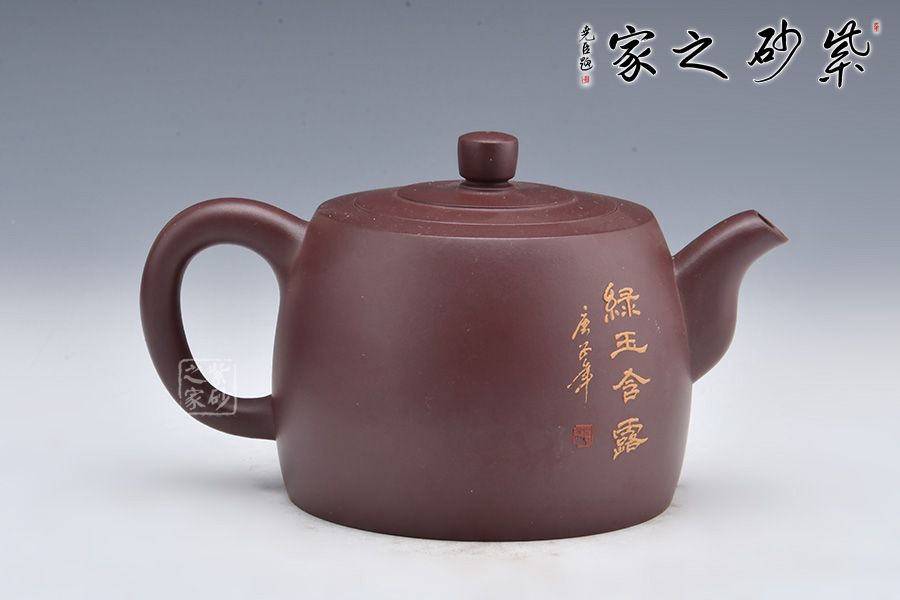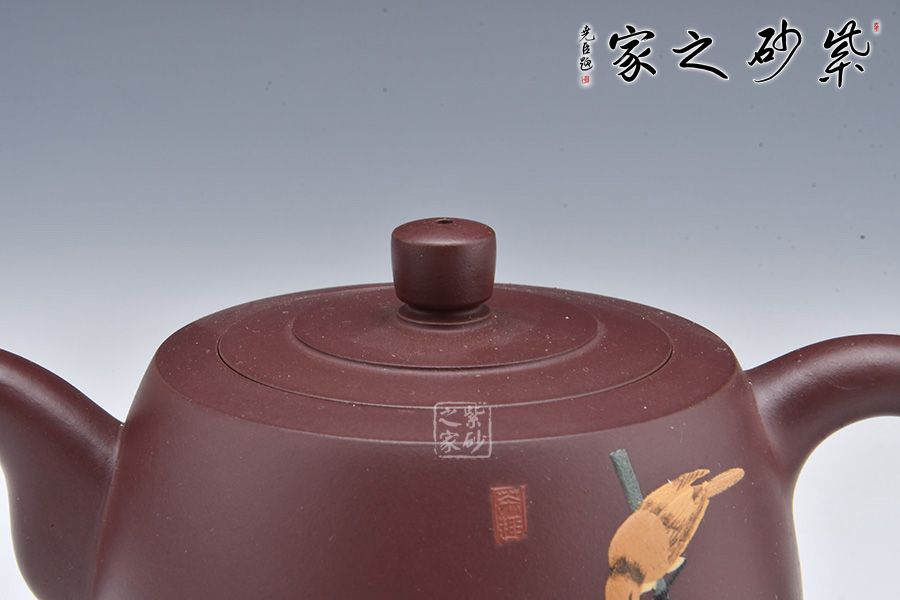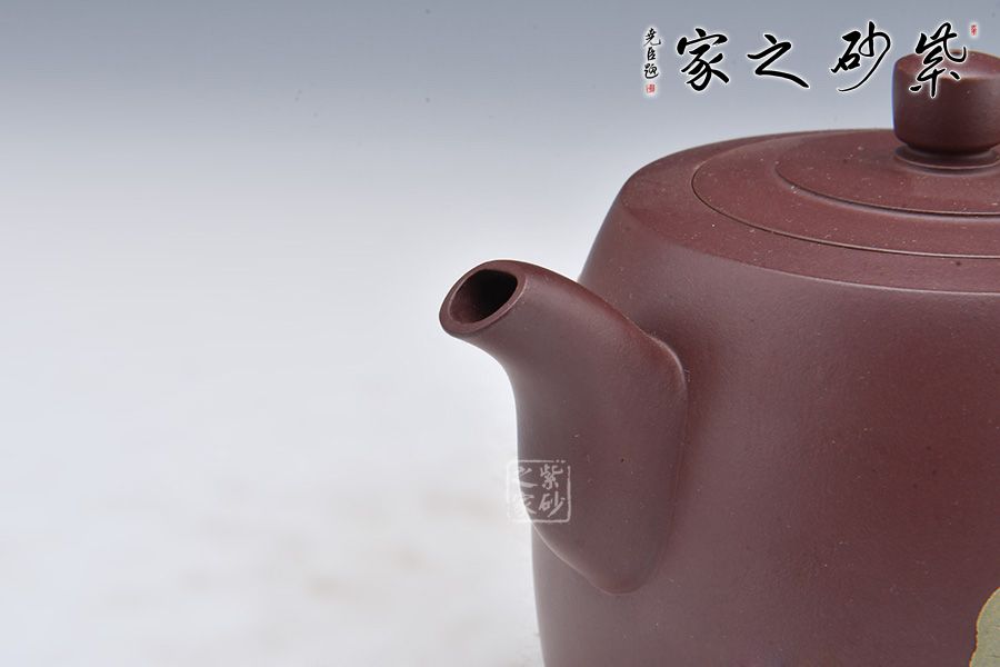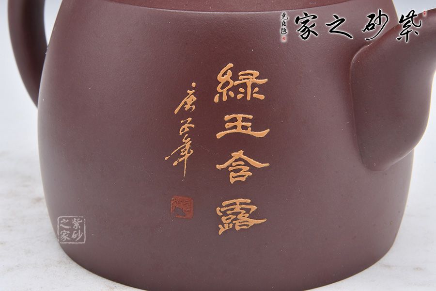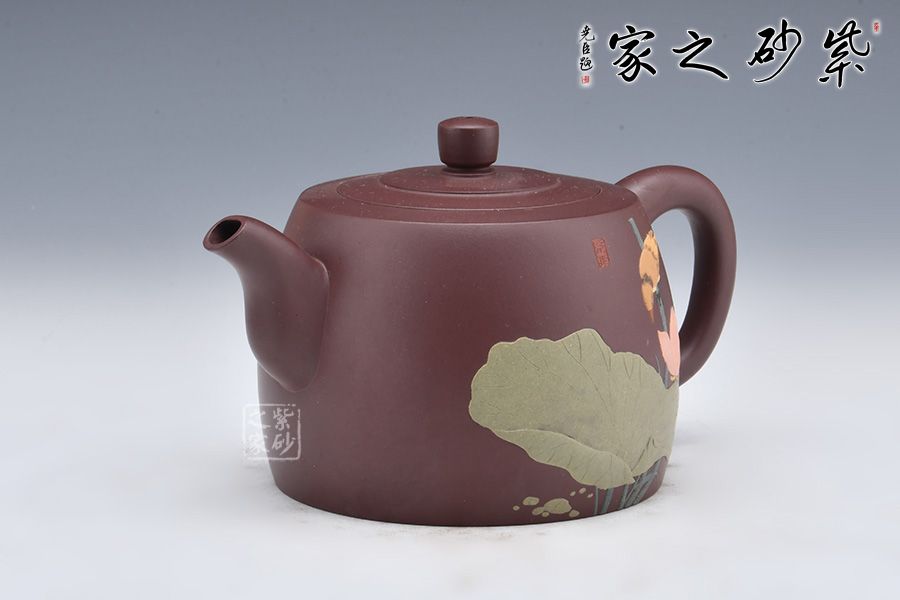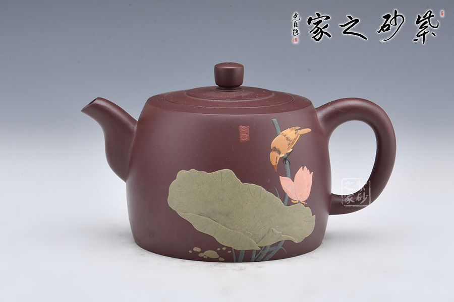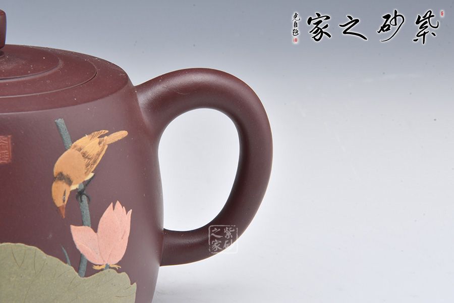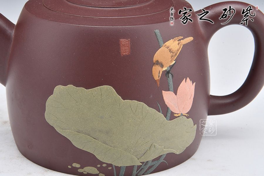 壺身泥繪裝飾,大大的荷葉,一朵荷花綻放在水里,小小黃鸝鳥聞香而來(lái),好一副荷塘美景;反面刻繪四個(gè)大字“綠玉含露”。整壺融泥繪、陶刻于紫砂壺中,意境高雅,是一把使用、賞玩皆宜的文人壺作品,值得收藏。