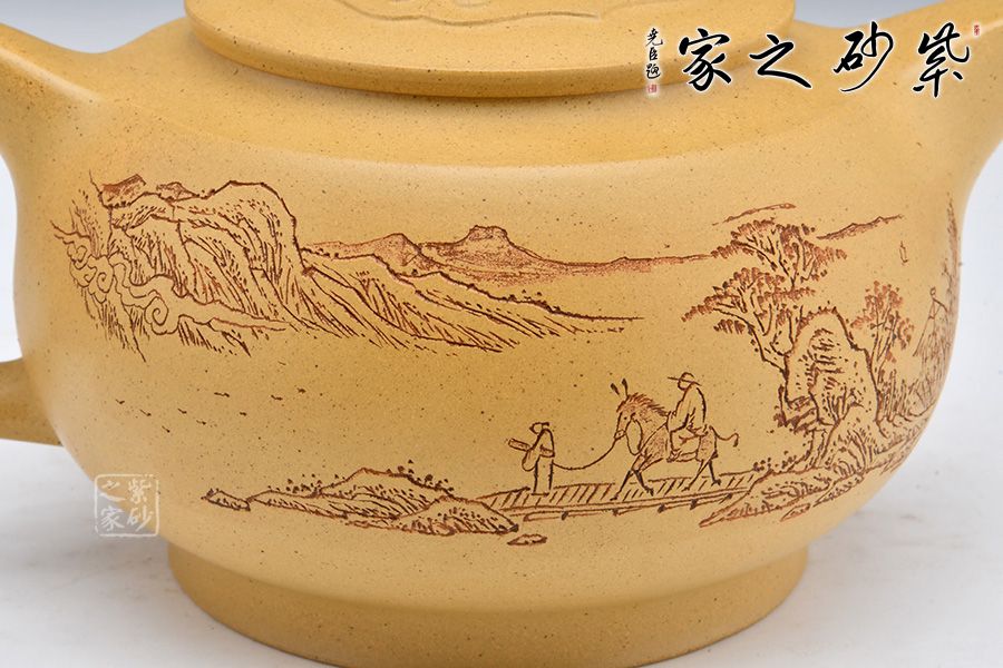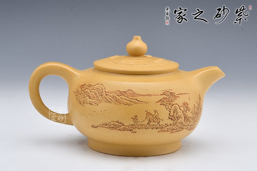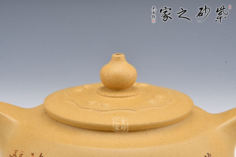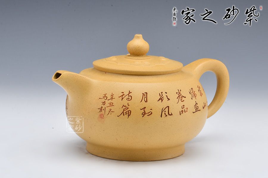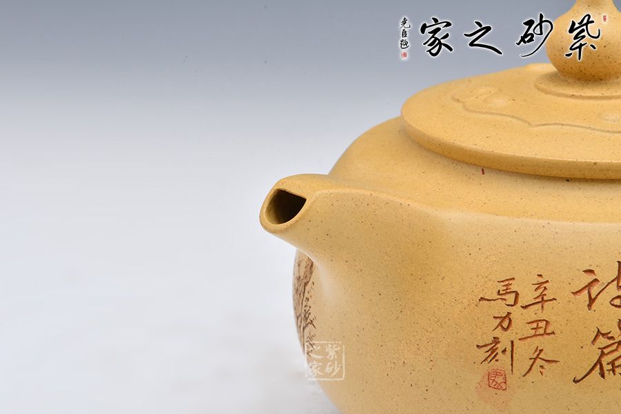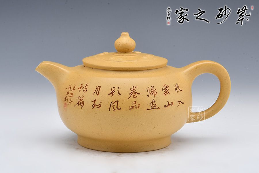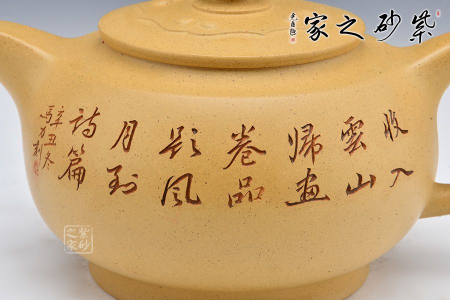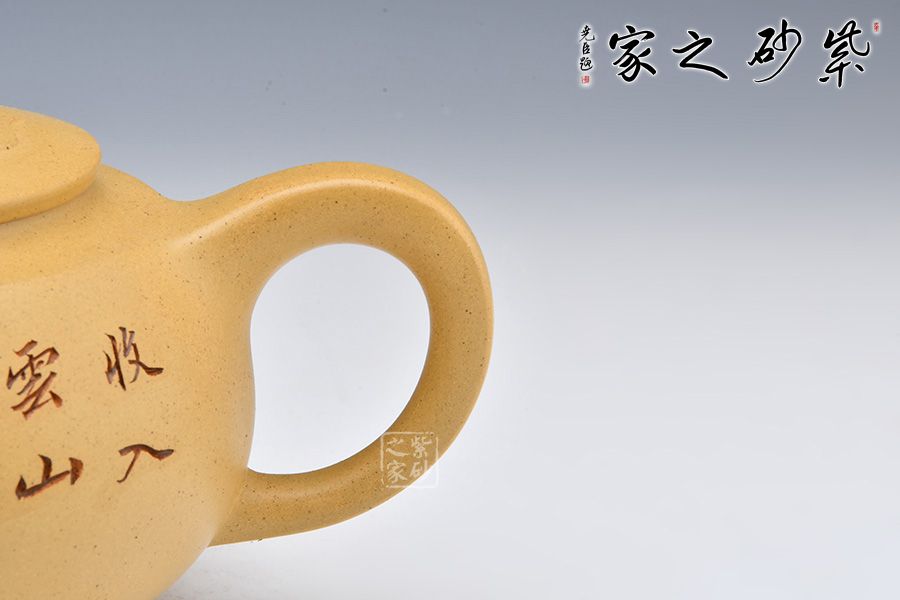 壺身扁圓,壺嘴呈鳥喙?fàn)?,短而嬌小,精美可愛。耳形壺把猶如小鳥的尾巴,把底與壺嘴相望,氣韻綿長。加入圈底,挺拔壺身。 刻繪“收入云山歸畫卷,品題風(fēng)月到詩篇”,字體優(yōu)美。整款壺顯得敦實而不笨拙,端莊雅致,為大家閨秀風(fēng)范,喜歡的壺友莫要錯過。