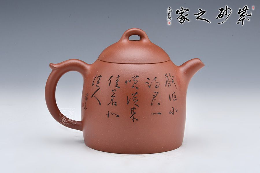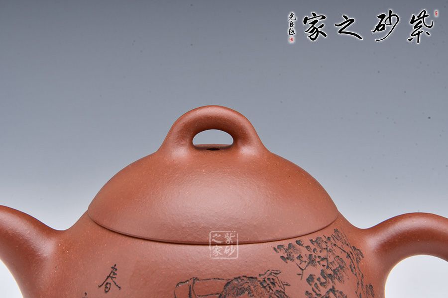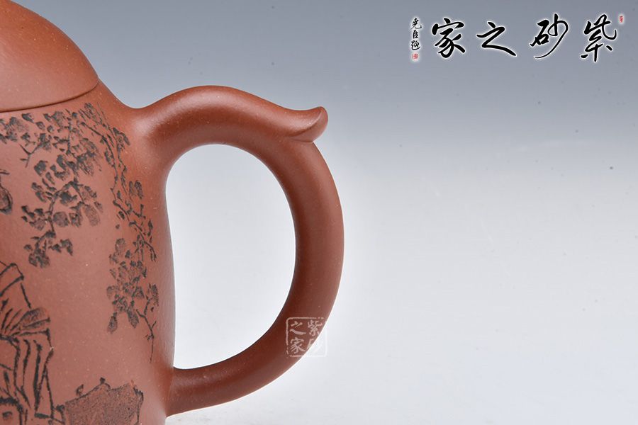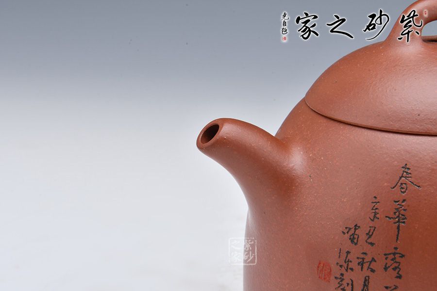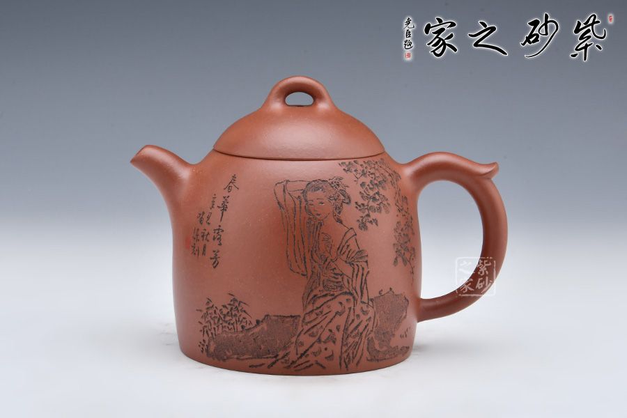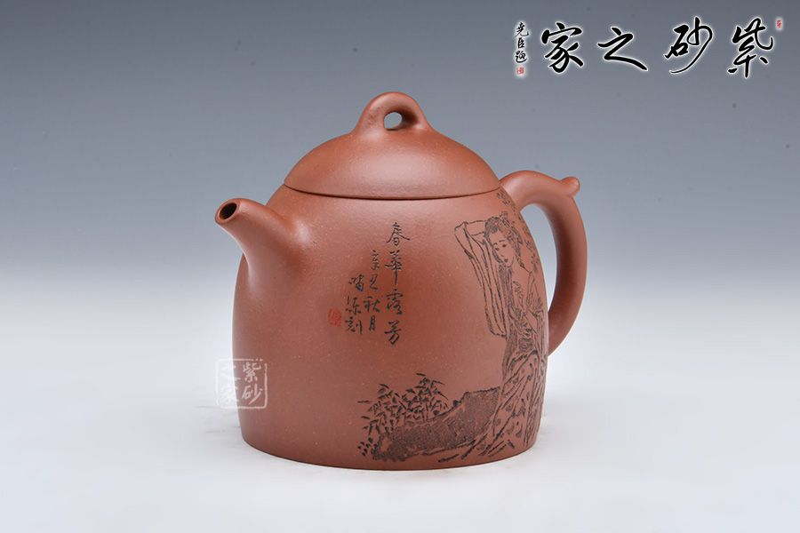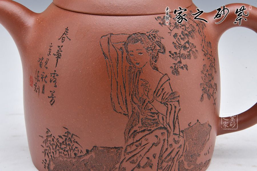 秦權(quán)壺,此壺為傳統(tǒng)經(jīng)典器型,仿秤砣形制構(gòu)思精巧,器型大氣。一彎嘴短而爽利,大耳形壺飛把,拿捏得手。整款壺以全截面接地,器型穩(wěn)重,截蓋,弧鈕鈕,整體器形完整,線條簡潔流暢。壺身雙面刻繪,正面刻繪一美女,寥寥幾筆神韻盡顯。反面刻“戲作小詩君一笑 從來佳茗似佳人”前后呼應(yīng)。整壺大氣和美,集實用與收藏于一體。