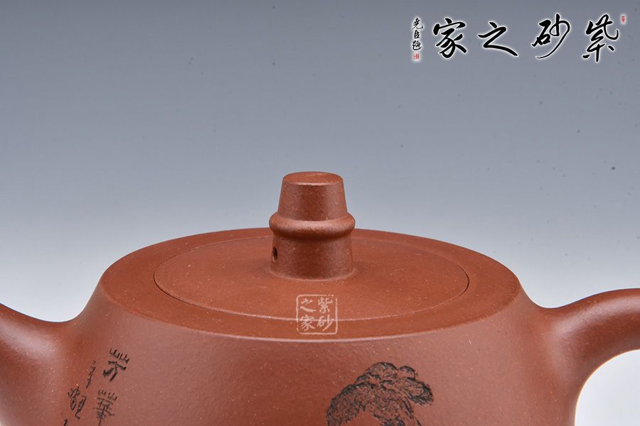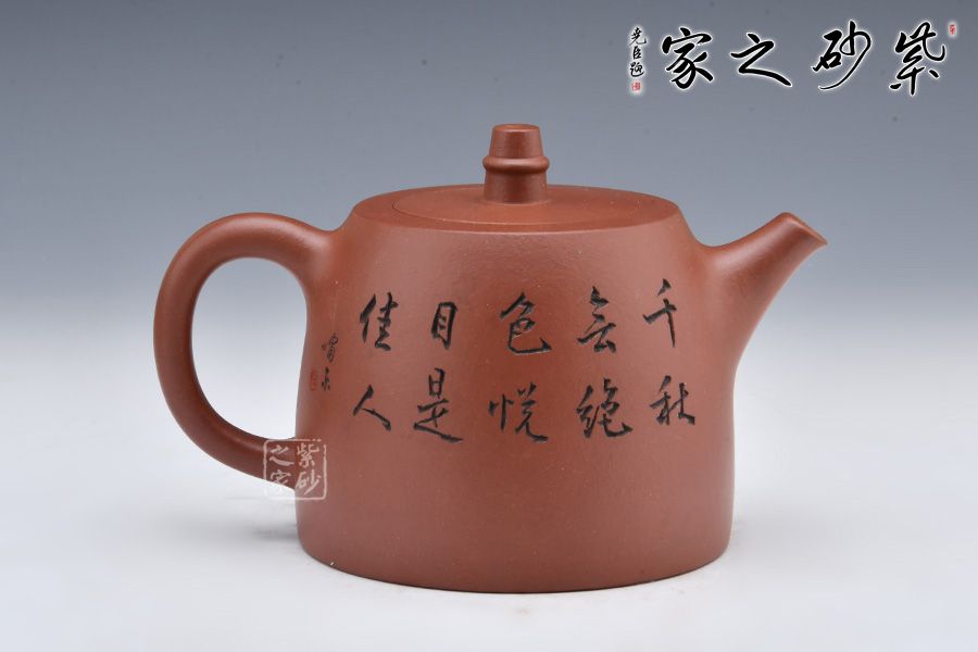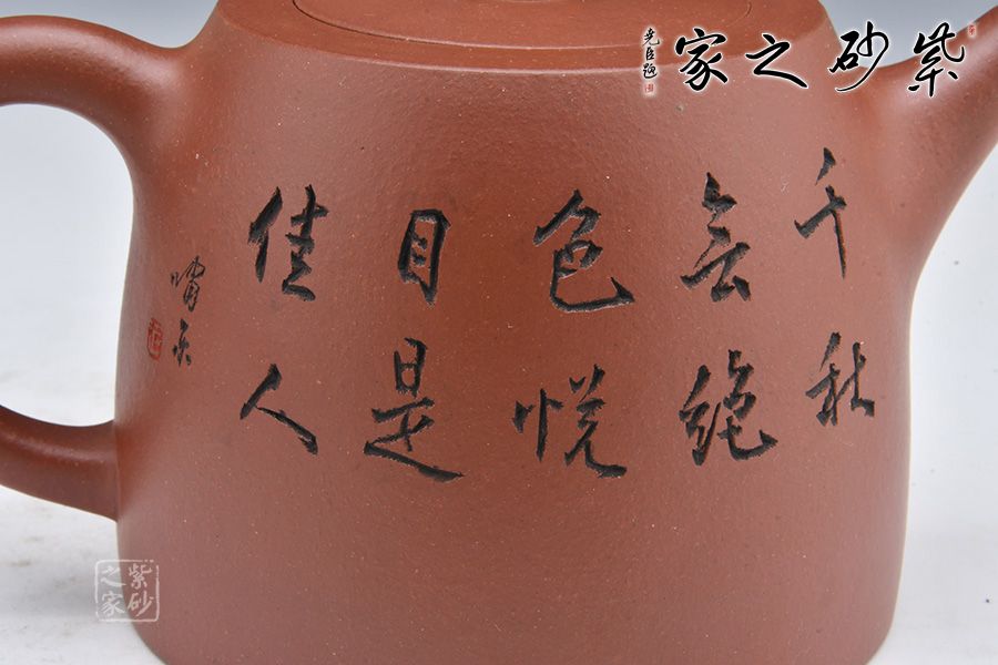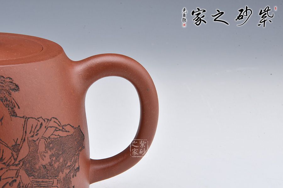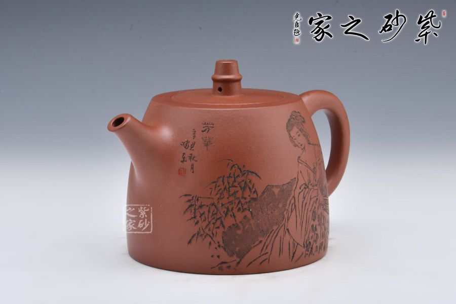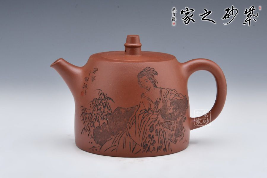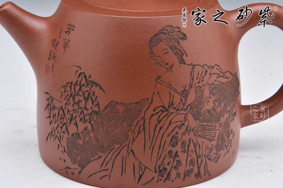 壺身反面陶刻“千秋無(wú)絕色悅目是佳人”,正面刻一絕代佳人,刻畫精細(xì),實(shí)乃精品品茗壺。