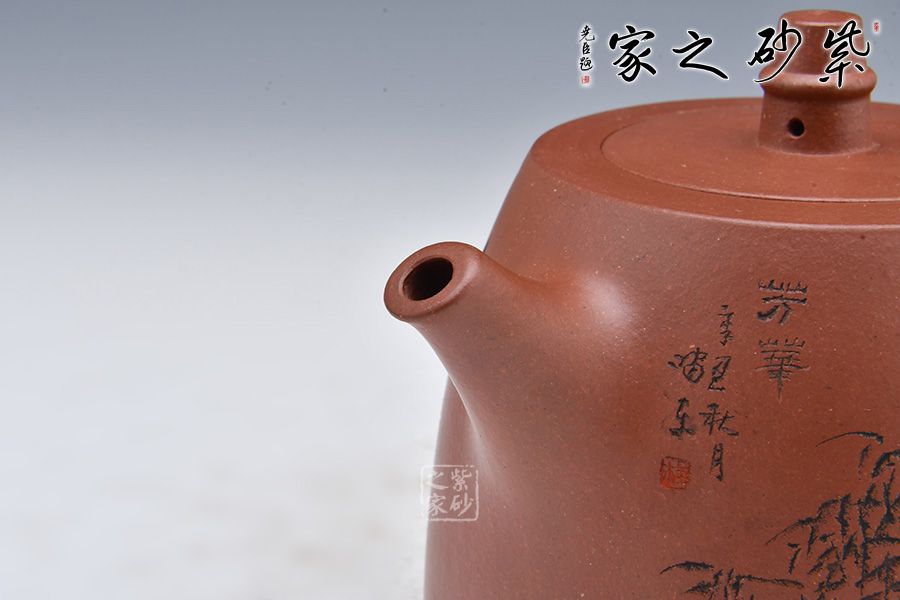漢鐸壺為經(jīng)典器型,壺體造型源自漢代之“鐸”,“以漢之鐸,為今之壺,土既代金,茶當(dāng)呼荼”。壺體為上收下寬的圓柱形,壺肩與嵌蓋吻合嚴(yán)密,口部平整嚴(yán)絲合縫一般。柱鈕直挺,揭拿口蓋十分便利。壺之流、把造型敦厚古拙,十分別致,整器實(shí)用性極佳!