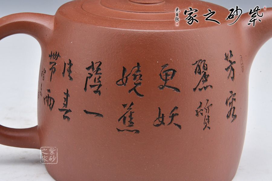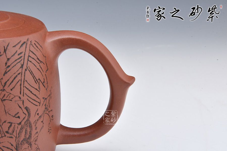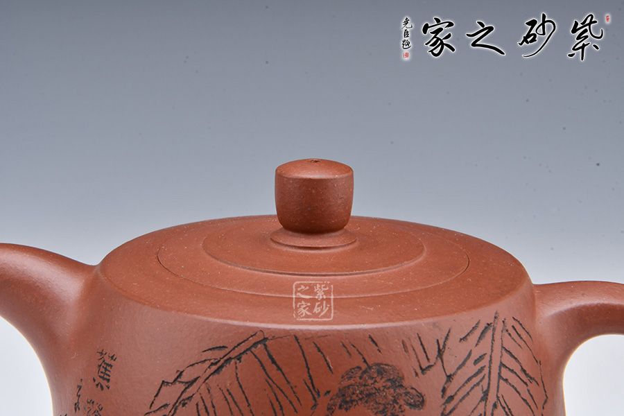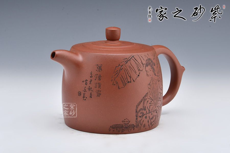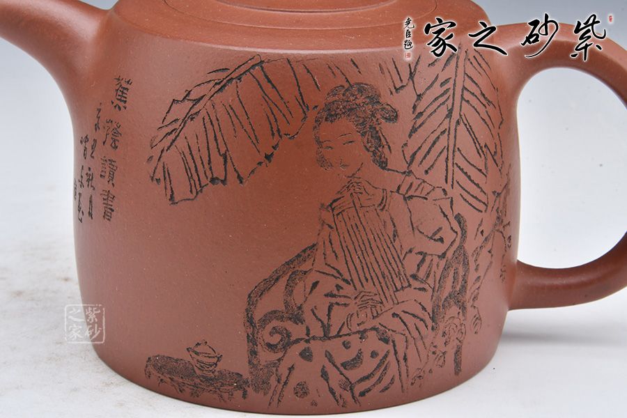 壺身陶刻一美女芭蕉樹(shù)下彈琴,寥寥幾筆刻畫精細(xì)。整壺融書畫、陶刻于紫砂壺中,意境高雅,是一把使用、賞玩皆宜的文人壺作品,值得收藏。