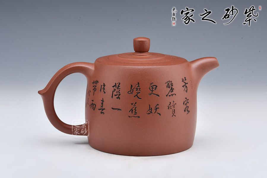 井欄壺起源于清代紫砂大家陳曼生,是紫砂的經(jīng)典器型之一。此壺選用原礦底槽清精制而成,泥色溫潤(rùn)古樸,以井欄為型,用弧線勾勒出圓柱體壺身,線條圓潤(rùn)有力,簡(jiǎn)潔明快。嵌蓋之上,壺鈕亦作圓柱狀,與壺身相互呼應(yīng),鈕上以圓珠飾之,氣勢(shì)挺拔,古韻十足。一彎流曲而微妙,配以環(huán)形耳把,盡顯悠揚(yáng)氣勢(shì),搭配得恰到好處。