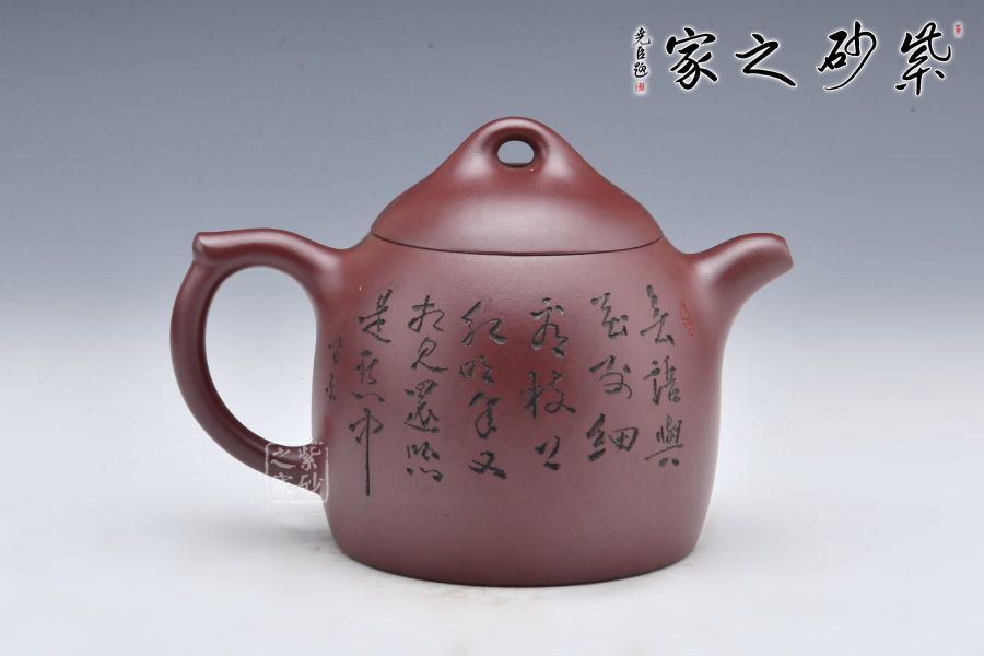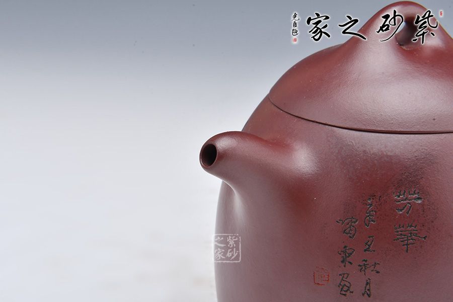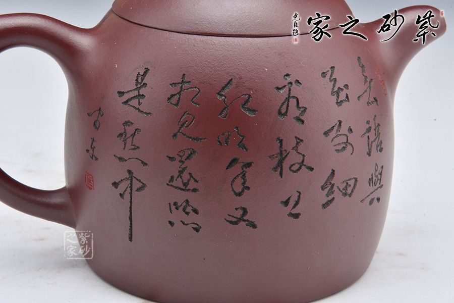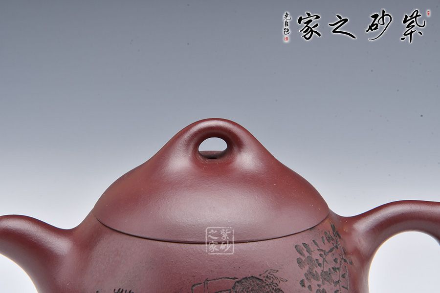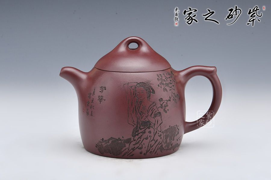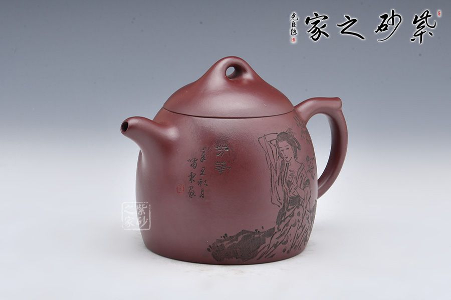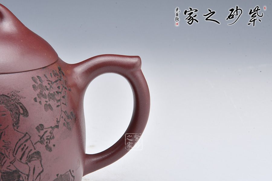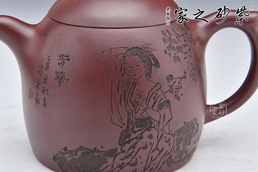 秦權(quán)壺為傳統(tǒng)經(jīng)典器型,仿秤砣形制構(gòu)思精巧,器型大氣。此壺采用龍血砂制成,泥料細(xì)膩,溫和中正。壺型似秤砣,嵌蓋微隆,一粒圓珠鈕立于其上。短流微微上曲,耳形壺把線條流暢。壺身陶刻一副美女簪花圖,刻畫精美,詩詞與景色相結(jié)合,亦景亦情,融合為一。