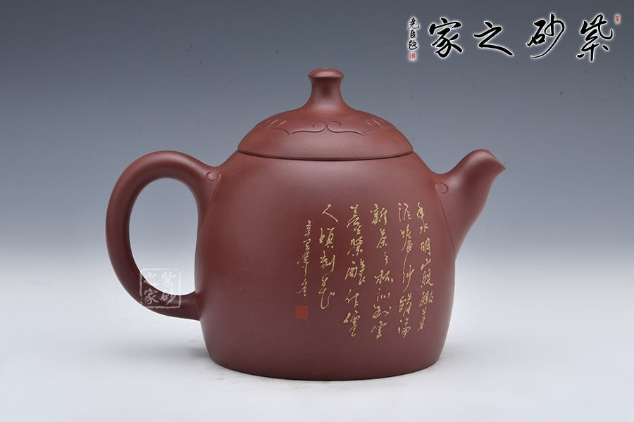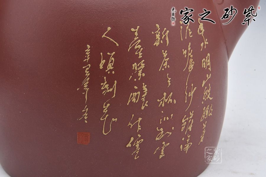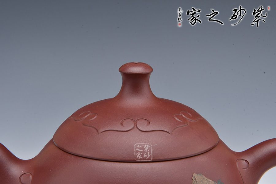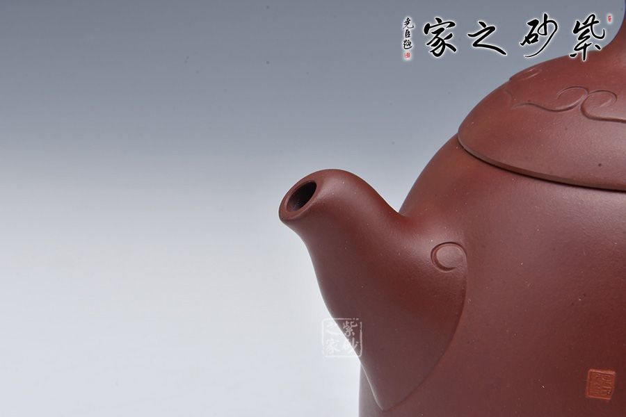 此壺紫茄泥制成,色澤紅潤清朗。整體造型為秦權(quán),敦厚古樸,流、把、蓋頂裝飾四季如意紋路,寓意如意吉祥。