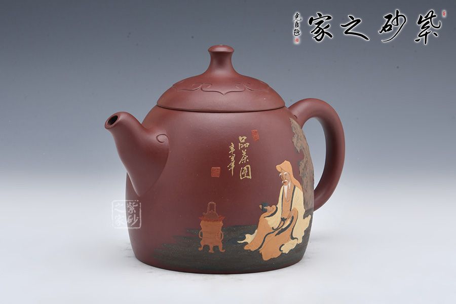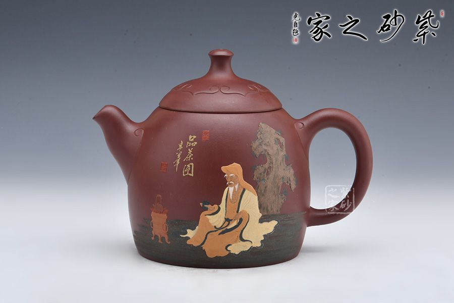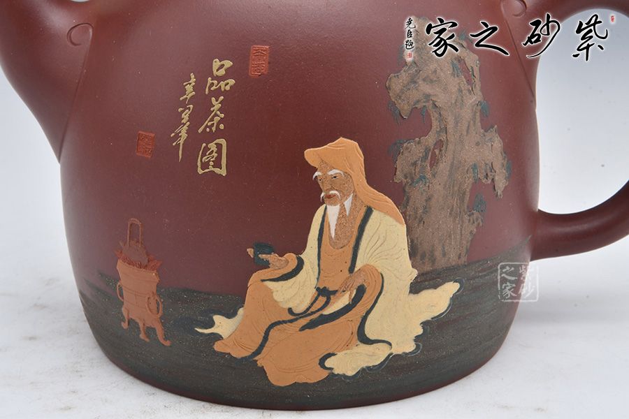 壺身老師又加入泥繪的裝飾,一老人席地而坐,盤著腿坐在地毯上品茶,背后一奇石而立,泥繪精細;反面又刻繪相關(guān)的詩詞“秀山明水綻嫩芽,泥爐沙罐淪新茶,三杯沁到云臺際,釀作仙人傾刻花”。